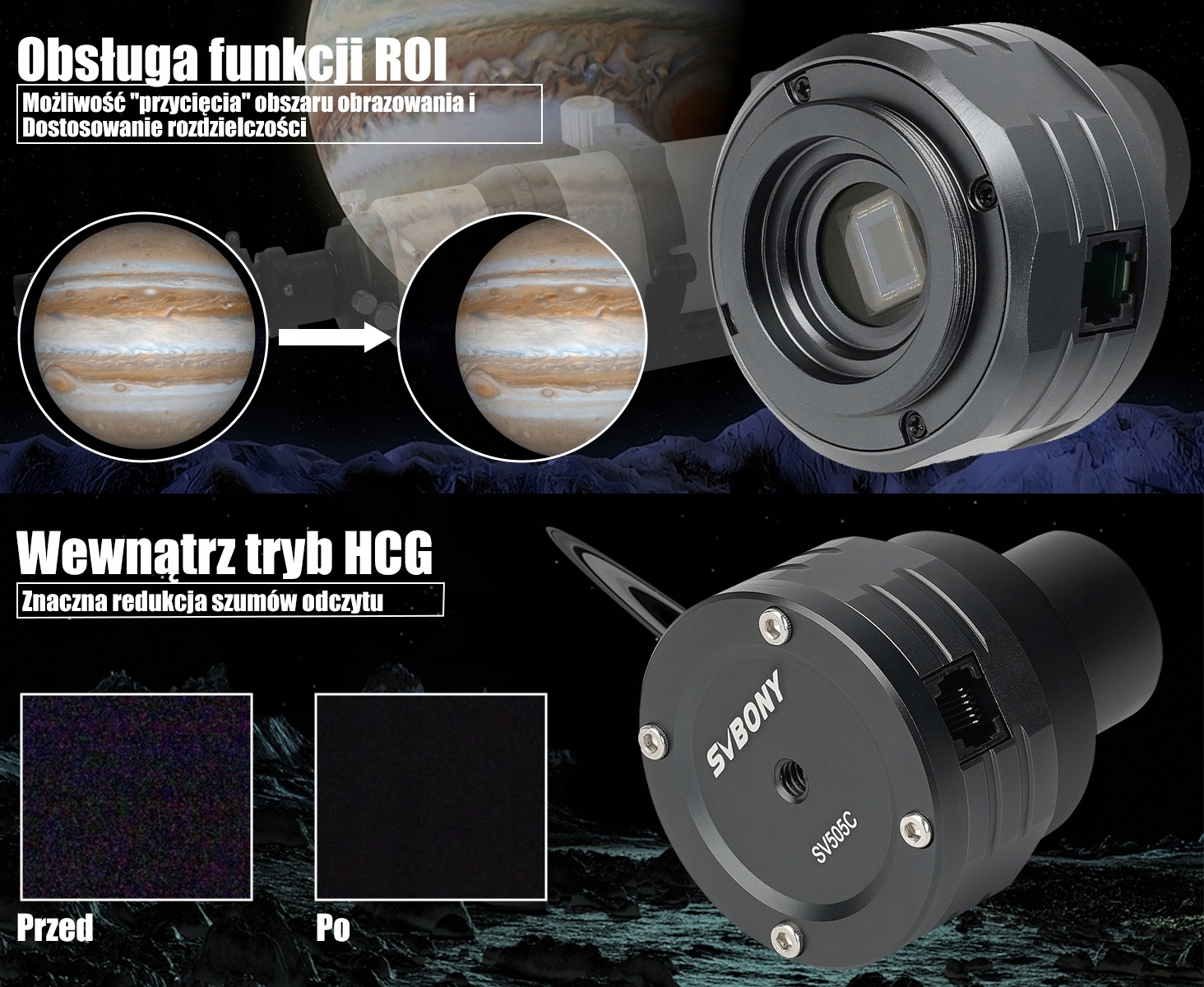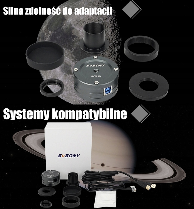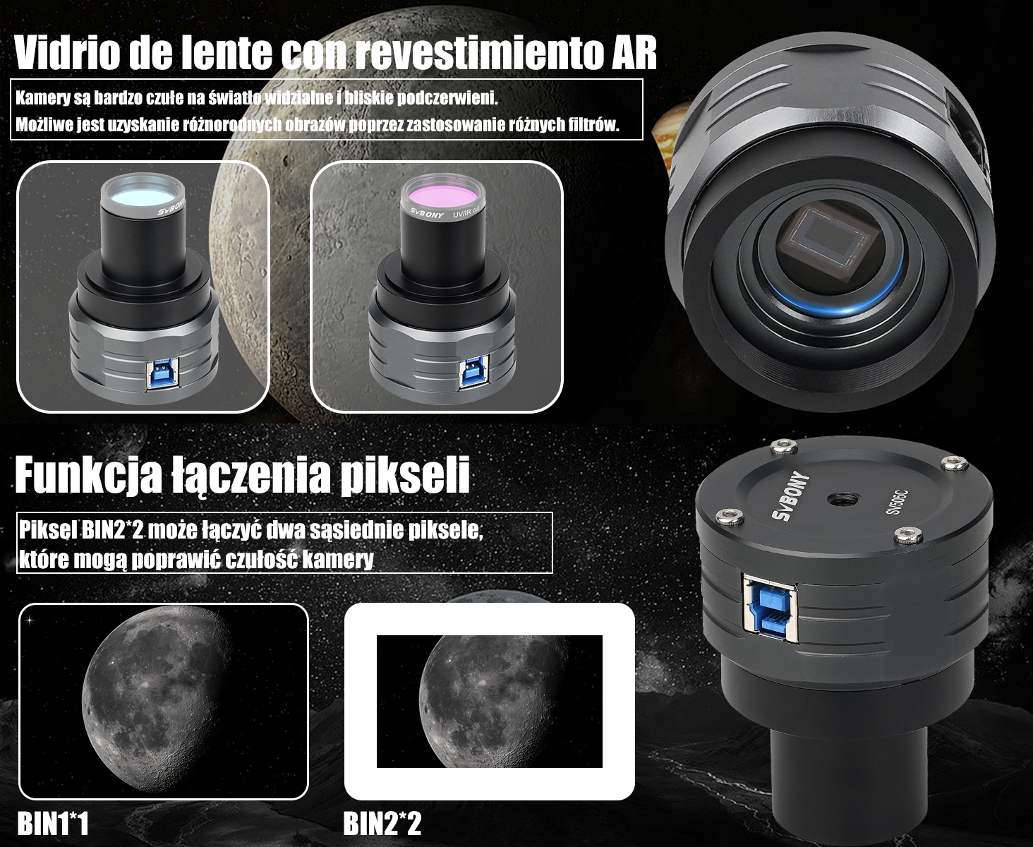 - SV505C має інтерфейс передачі даних USB 3.0, вбудовану високошвидкісну пам’ять DDR3 об’ємом 128 МБ для буферизації даних зображення для забезпечення стабільної передачі даних. Підходить для швидкого та ефективного знімання планет, Місяця та Сонця.