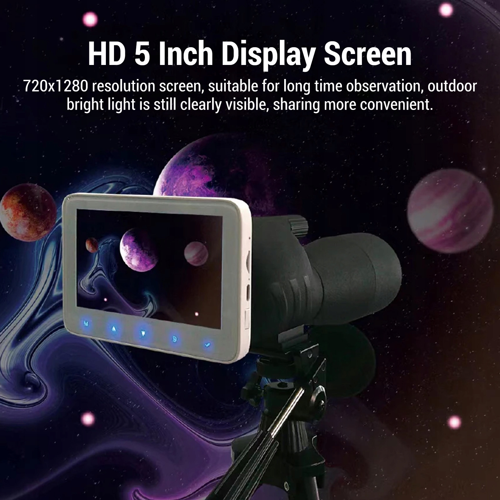 2. 5-дюймовий дисплей високої чіткості: Цифрова камера-окуляр телескопа має роздільну здатність 720x1280, що підходить для тривалих сеансів спостереження. Його дизайн забезпечує яскравість навіть за яскравих вулиць, що дозволяє легко переглядати та ділитися своїми відкриттями з друзями та іншими ентузіастами без жодних проблем.