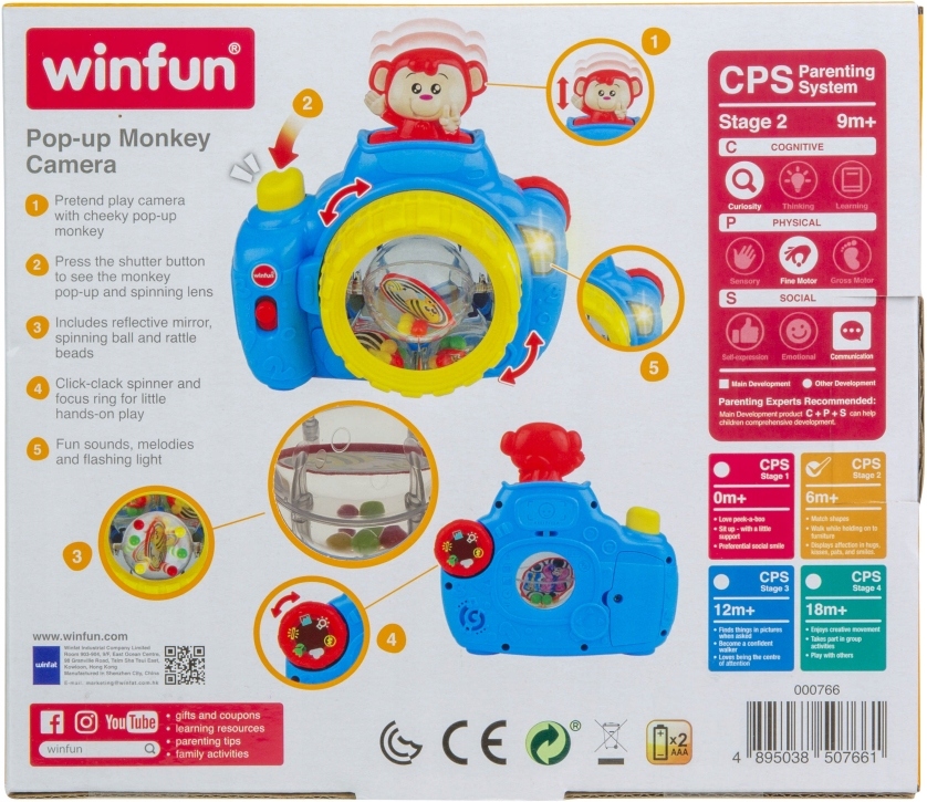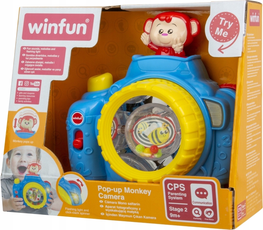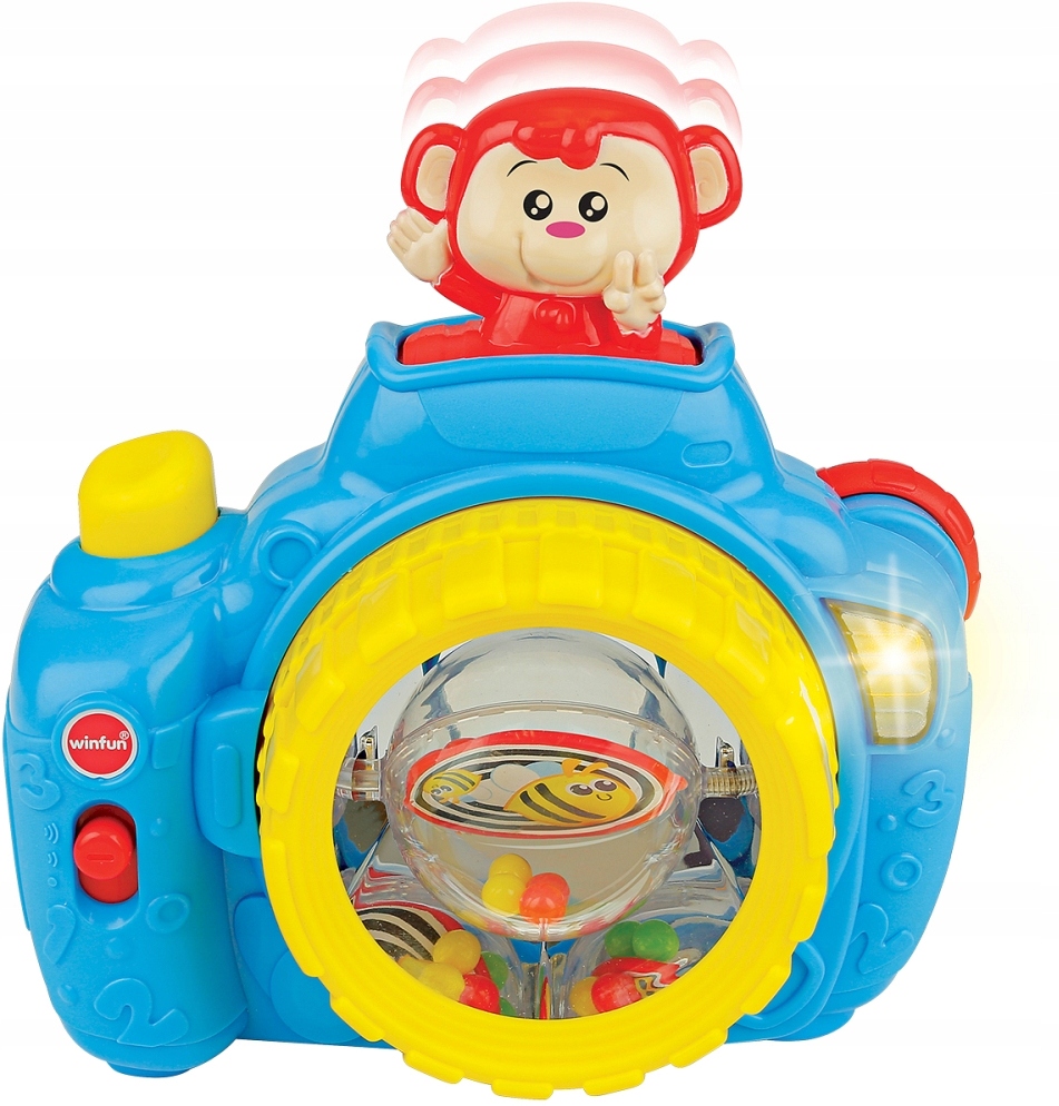 Натисніть мавпу рукою, і ви почуєте звуки, видані цією екзотичною твариною. У об'єктиві є храпочка з бджолами. Натисніть жовту кнопку, щоб кулька з бджолами почала крутитися. Поверніть ободок об'єктива, встановіть його, щоб зробити ідеальну фотографію. Ви почнете мелодії, звук зробленої фотографії, звуки мавпи та світла.
