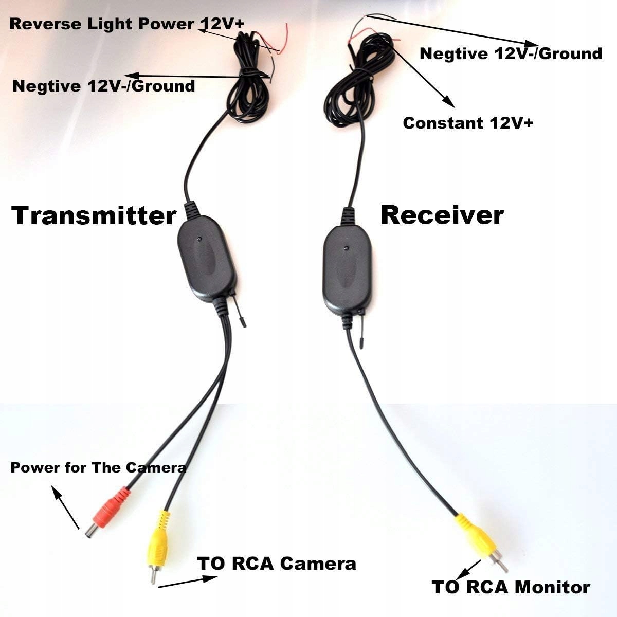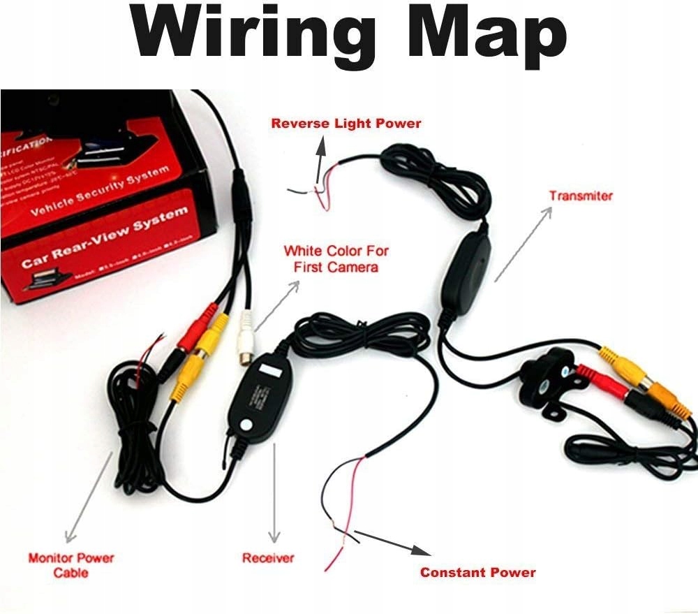 - Блок живлення 12 В, спеціально розроблений для підтримки резервного копіювання автомобіля. Проста проводка за допомогою кабелю заземлення та живлення та двох бездротових відеокабелів (RX і TX)