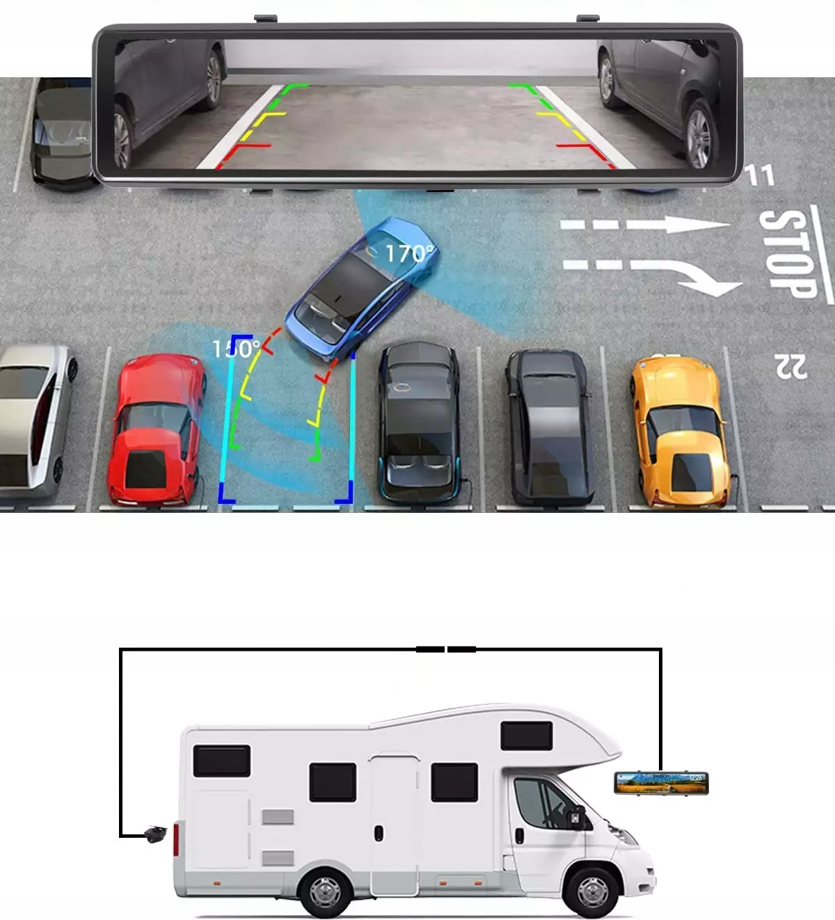 реєстратор, дзеркало заднього виду (кабель камери 6 м або 10 м за додаткову плату), відеореєстратор, камера заднього виду, сенсорний екран 12 дюймів, камера, автоматичний запуск, режим моніторингу паркування, запис звуку, 3-осьовий датчик g-force - G-Sensor, паркування режим, запис положення GPS, бездротовий зв'язок WiFi, циклічний запис, вбудований мікрофон і динамік, пристрій для читання карт пам'яті TF/SD макс. 256 ГБ. , міні-роз’єм USB, чудове нічне бачення, кут огляду передньої камери 170° (4K UHD) і задньої камери 140° (1080P) ), HDR, WDR, а також: