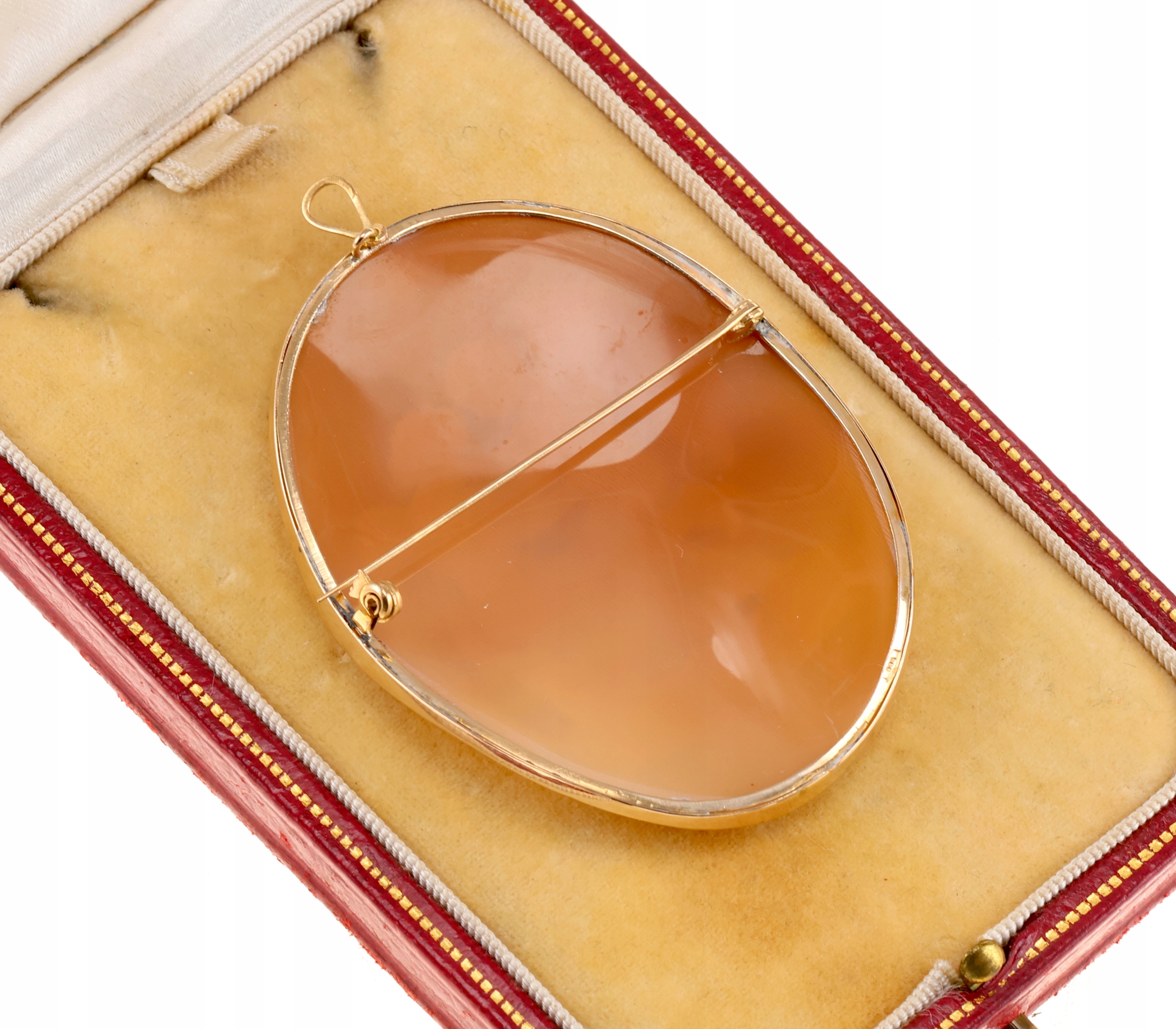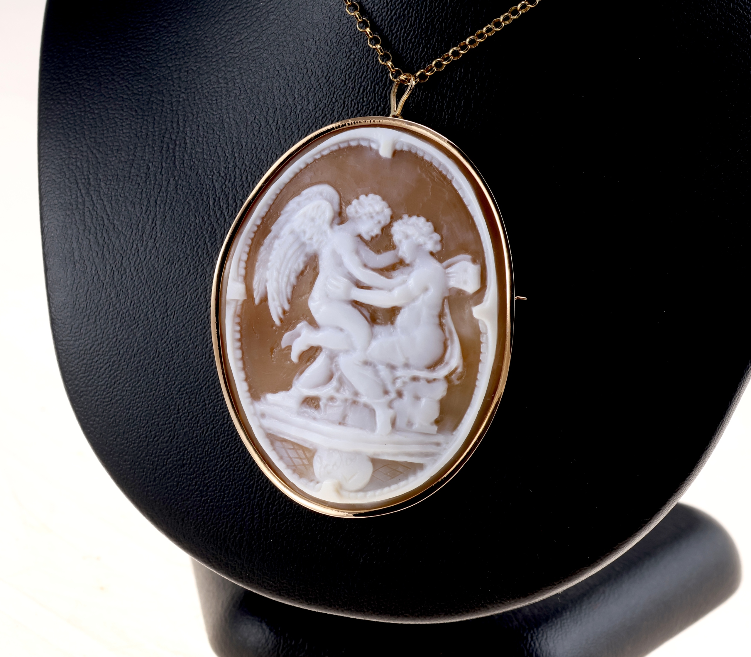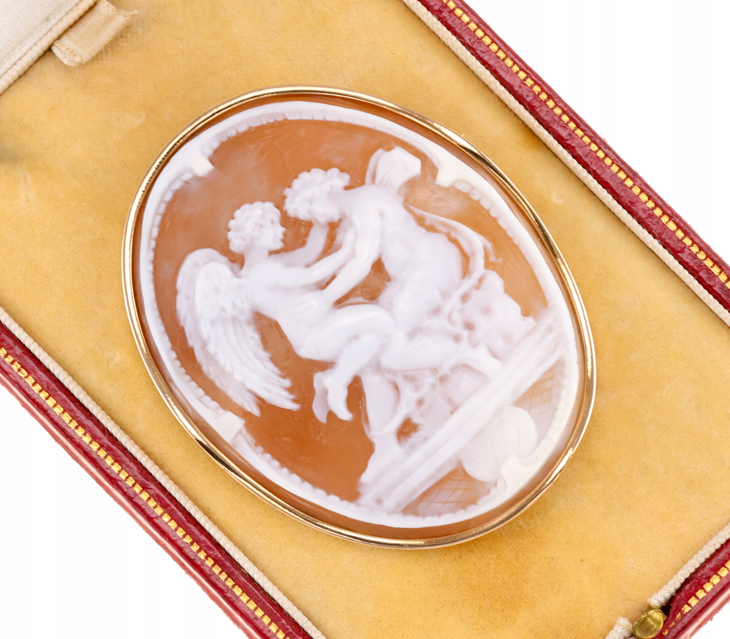 Предметом продажу є камея, що презентує Купідон і Психея, міфологічний мотив, особливо популярний у мистецтві 19 століття, що символізує духовне та чуттєве кохання. Витончена сцена зустрічі крилатого Купідона та делікатної Психеї, передана з витонченістю та гармонією класичної композиції.
