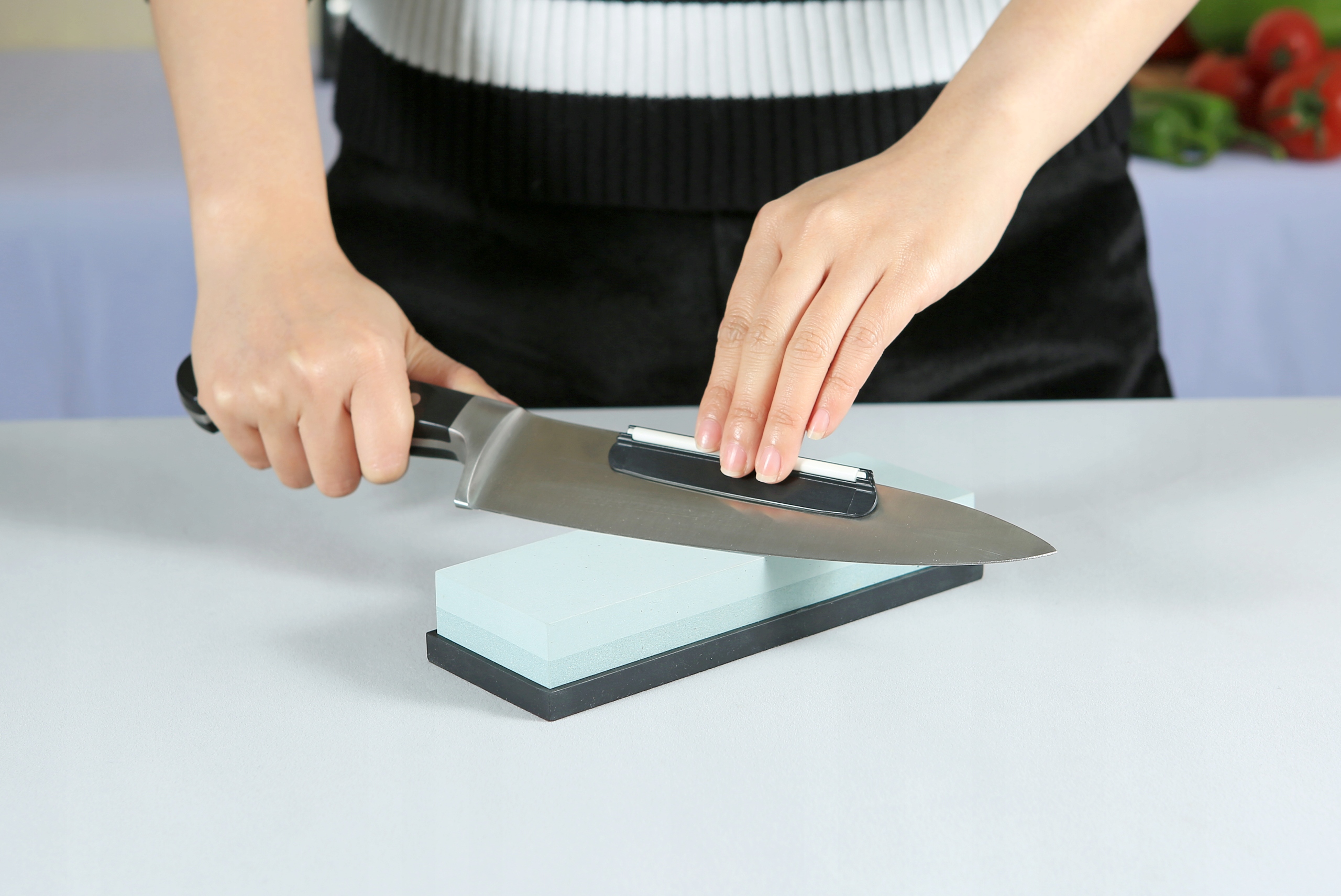 Перед початком процесу заточування ножа , занурте точильний камінь у воду. Весь точильний камінь слід занурити приблизно на 10 хвилин або доки не перестануть утворюватися бульбашки. Це дозволить вам підтримувати відповідні умови вологості під час заточування.