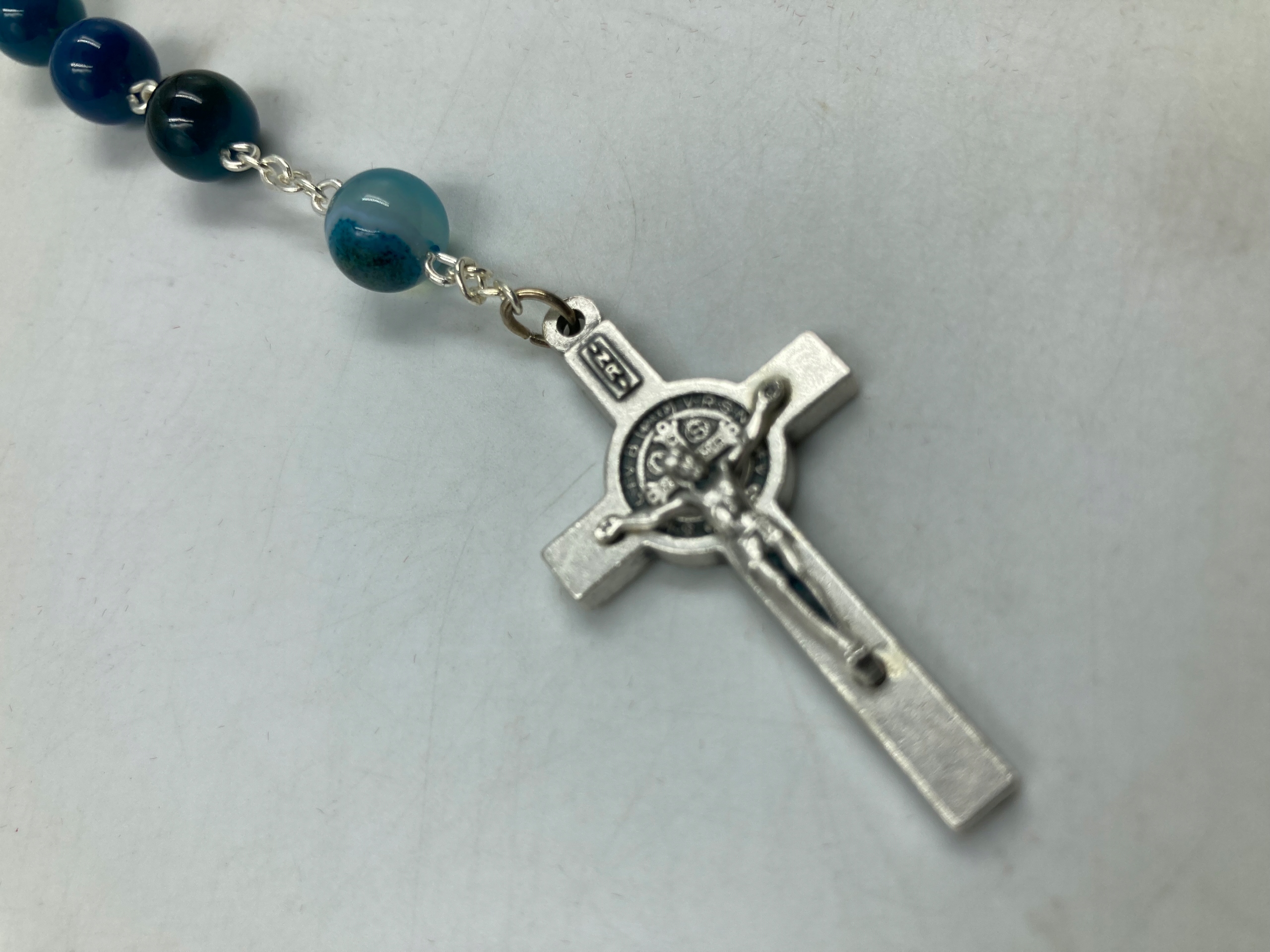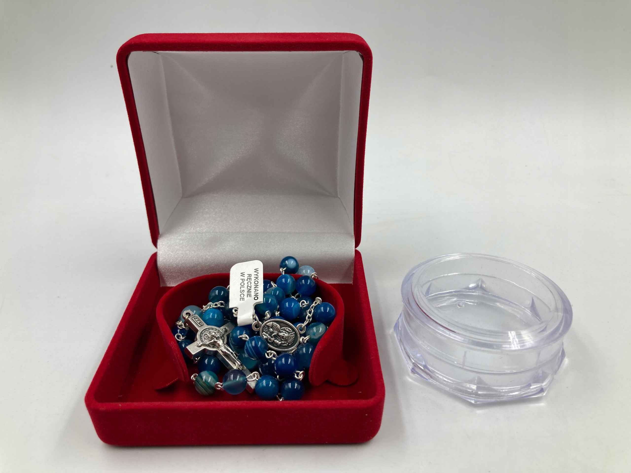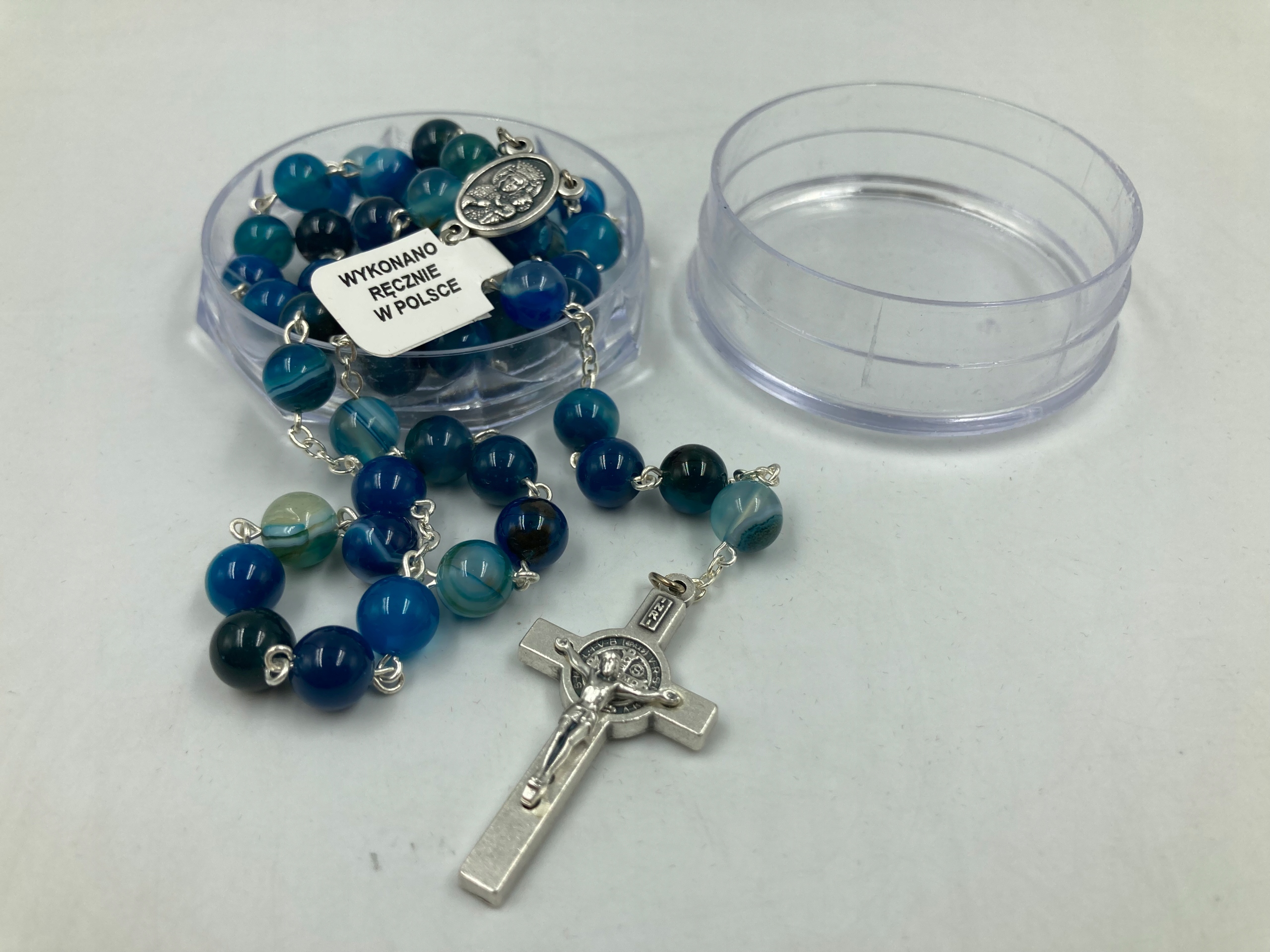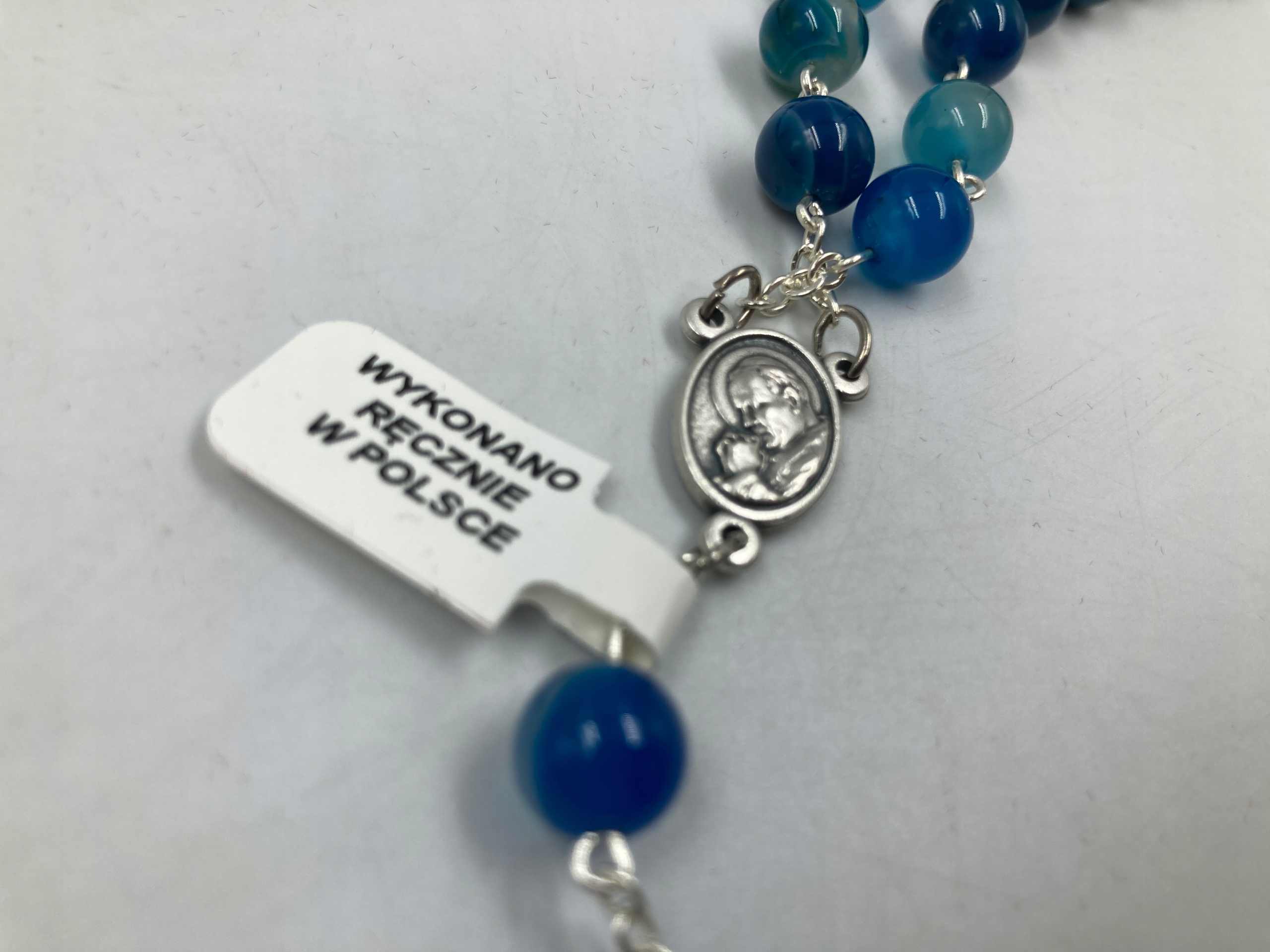Представляємо унікальну вервицю польського виробництва, намистини якої виготовлені з феноменального природного каменю - Блакитного агату. Решта елементів, як-от з’єднання, хрест і медальйон, були виготовлені з металу. Все виглядає солідно і надзвичайно акуратно.