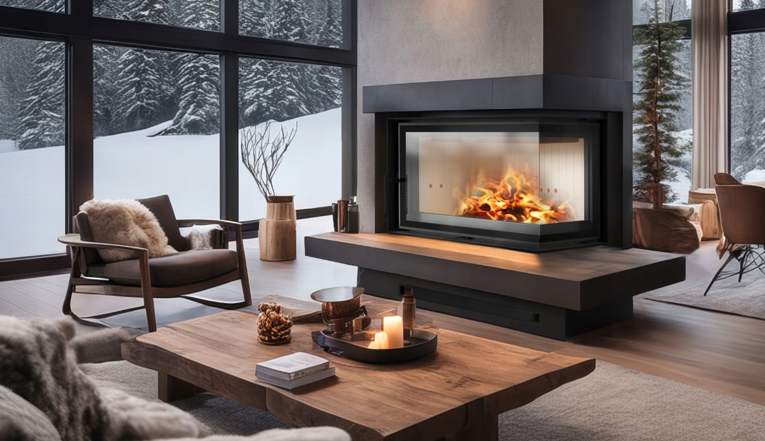 Естетичний чорний декор надає каміну елегантний вигляд, що робить його не тільки функціональним елементом, а й привабливим доповненням інтер'єру.