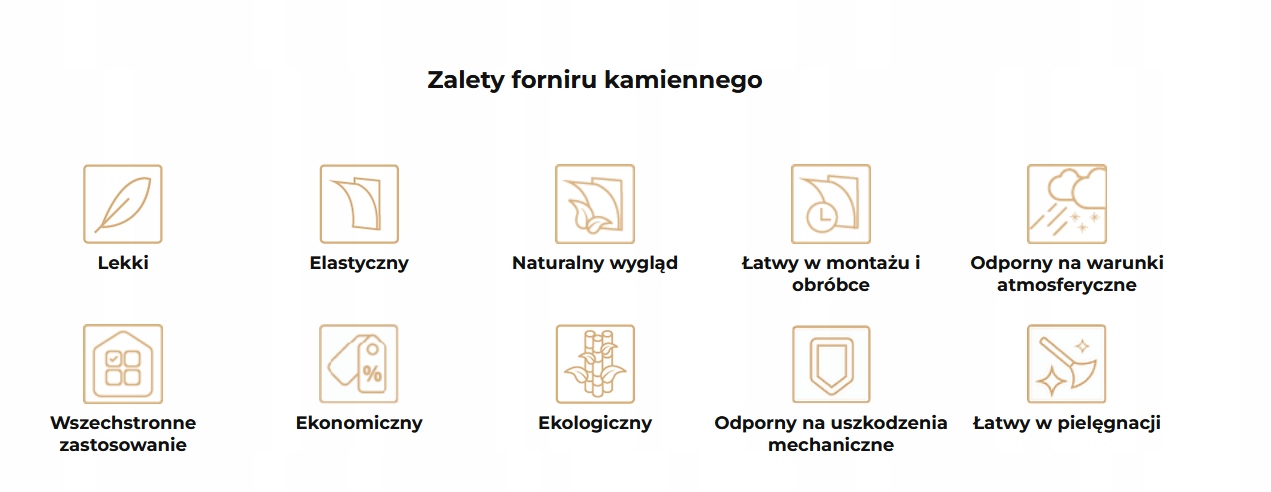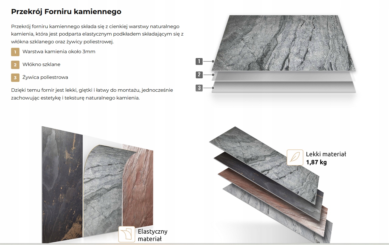Кам'яний шпон - це тонкий шар натурального каменю на основі смоли та скловолокна, доступний у різних форматах. Він характеризується високою твердістю, довговічністю та унікальними візерунками, які може створити лише природа. Крім того, його легка і гнучка форма дозволяє ефективно використовувати його для обробки будь-якого інтер'єру і будь-якої поверхні, крім підлоги і стільниць. Після належного просочення він також чудово працює у вологих приміщеннях, як простір між кухонними шафами або як фасад будівлі.