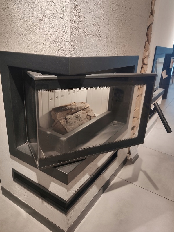 Вставні двері мають сучасну ручку. Його спеціальна перфорована структура забезпечує природне охолодження. Зручна ручка гарантує зручне відкриття каміна.
