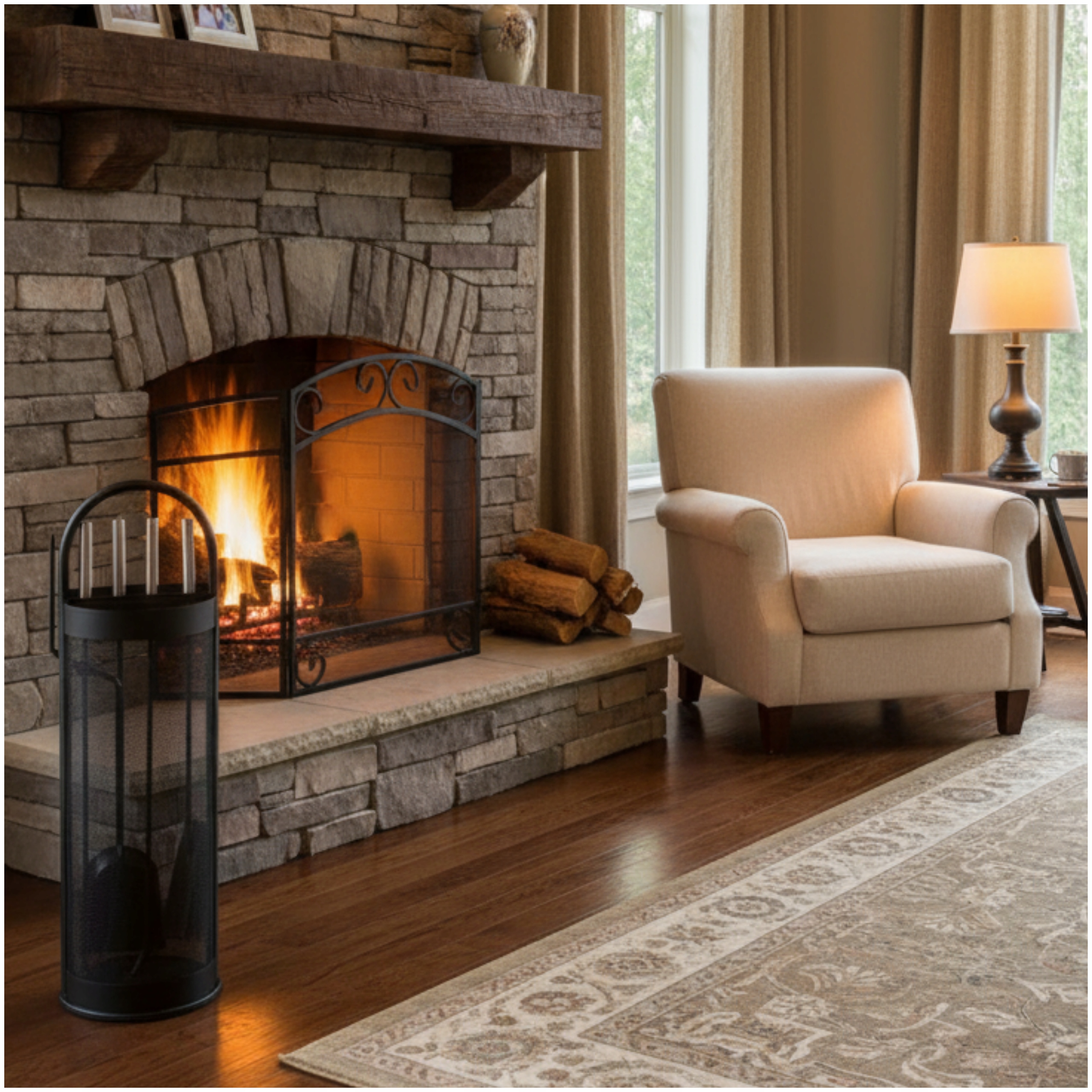 У набір входять п'ять необхідних аксесуарів: підставка, щипці, совок, мітла і кочерга. Завдяки цьому у вас є все під рукою, щоб керувати каміном і підтримувати все в порядку. Це практичне рішення, яке позбавляє від необхідності купувати додаткові інструменти.