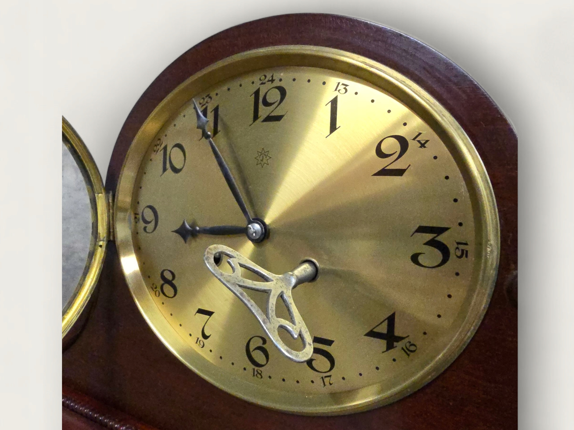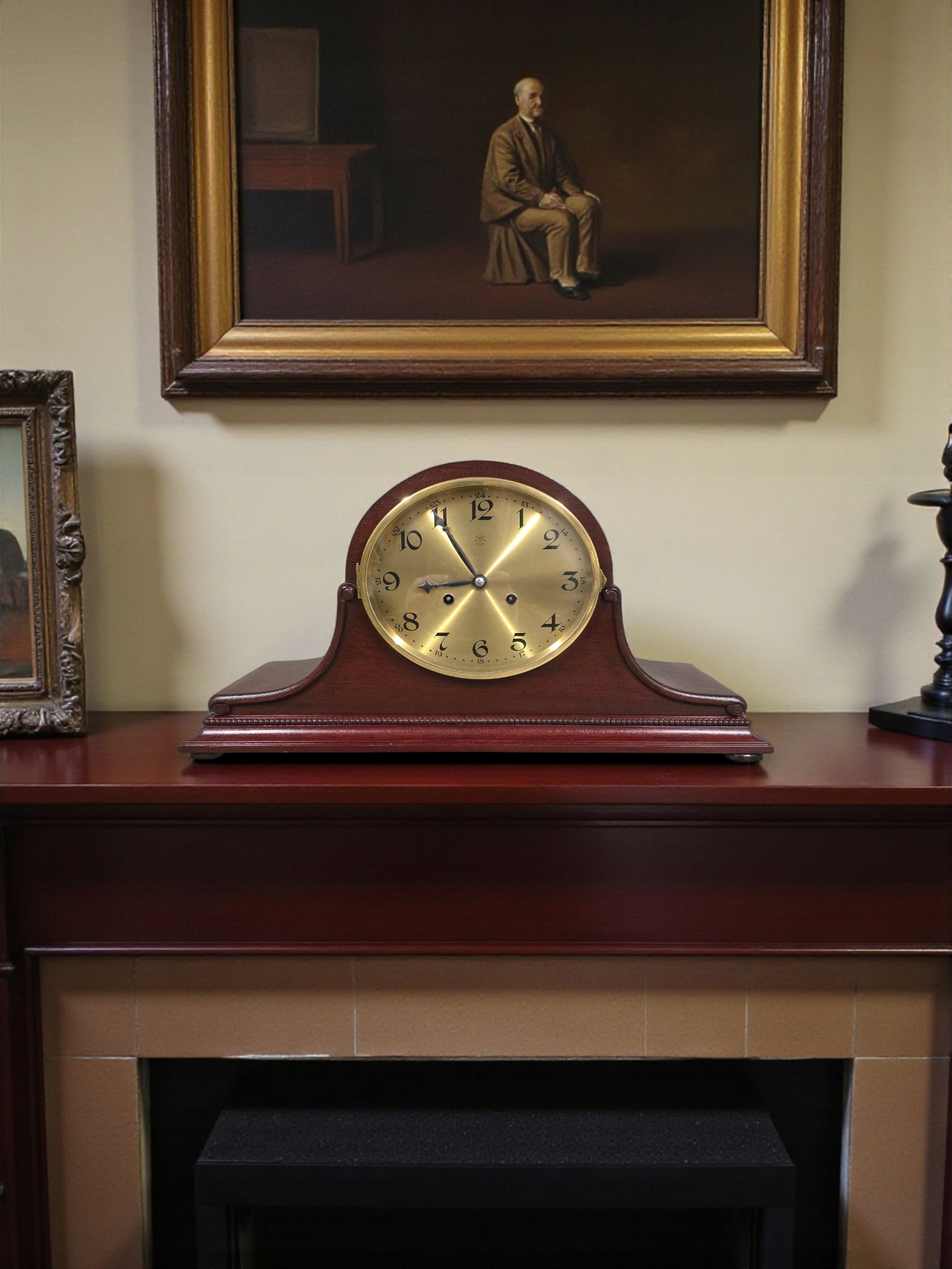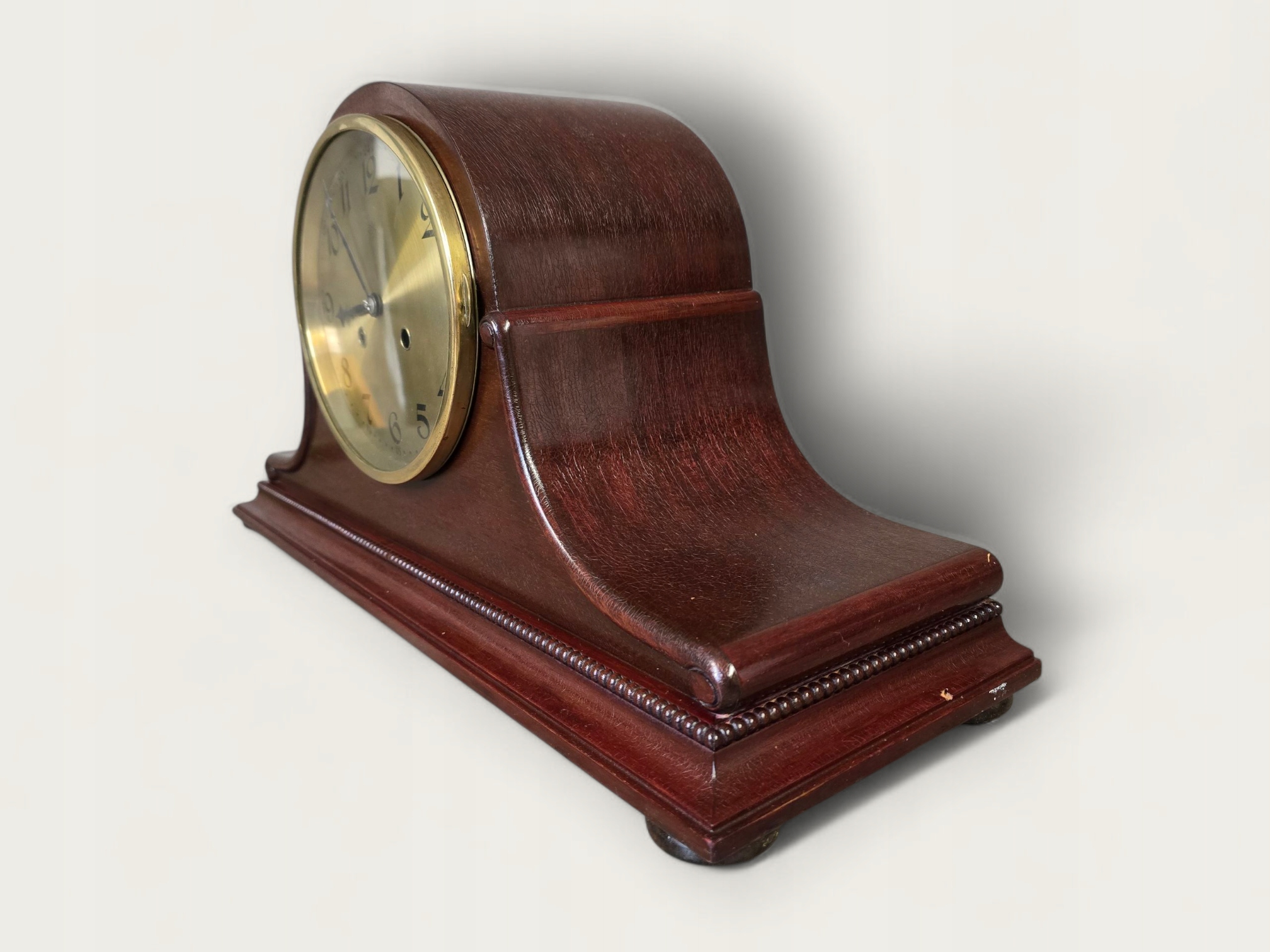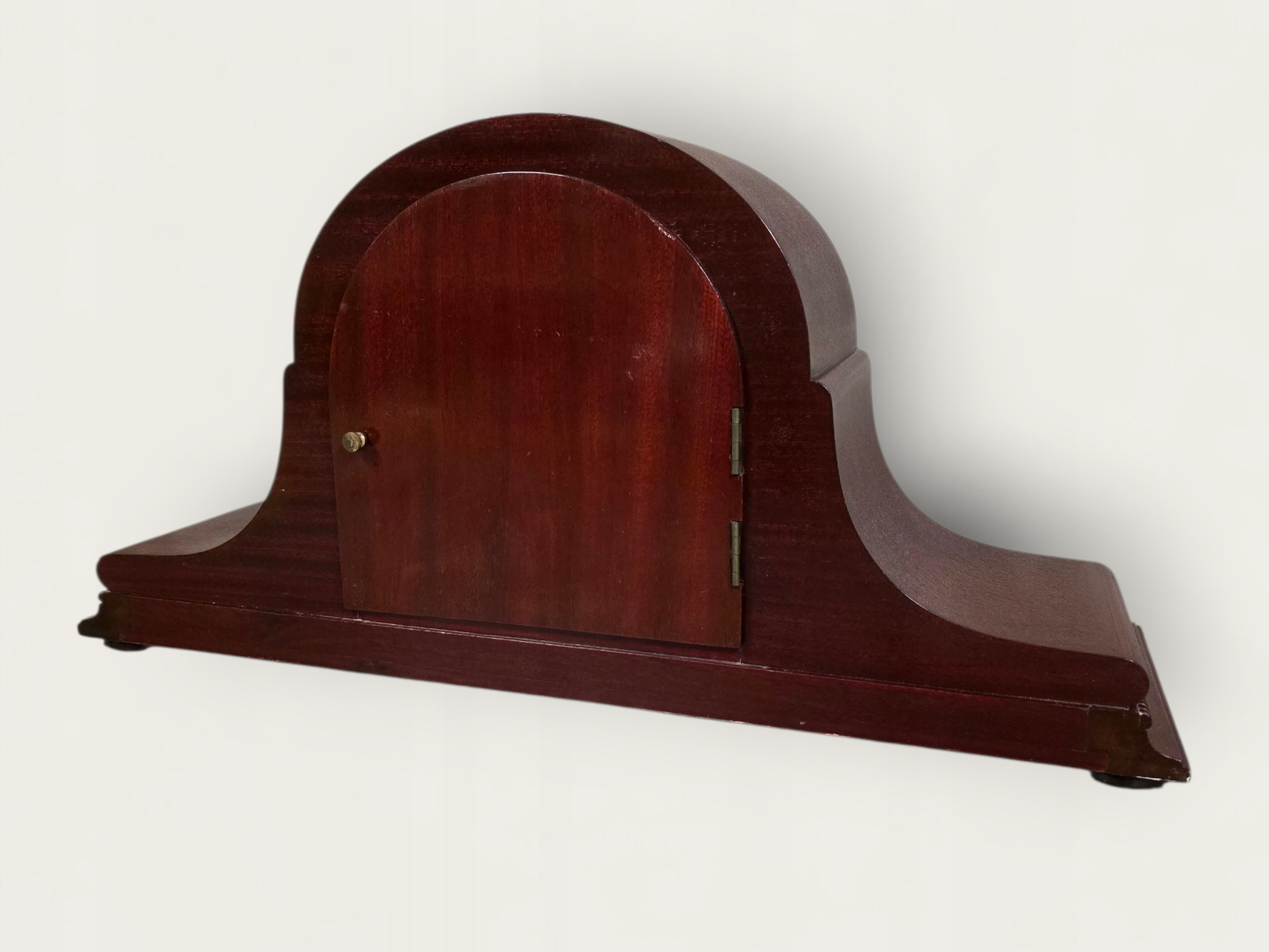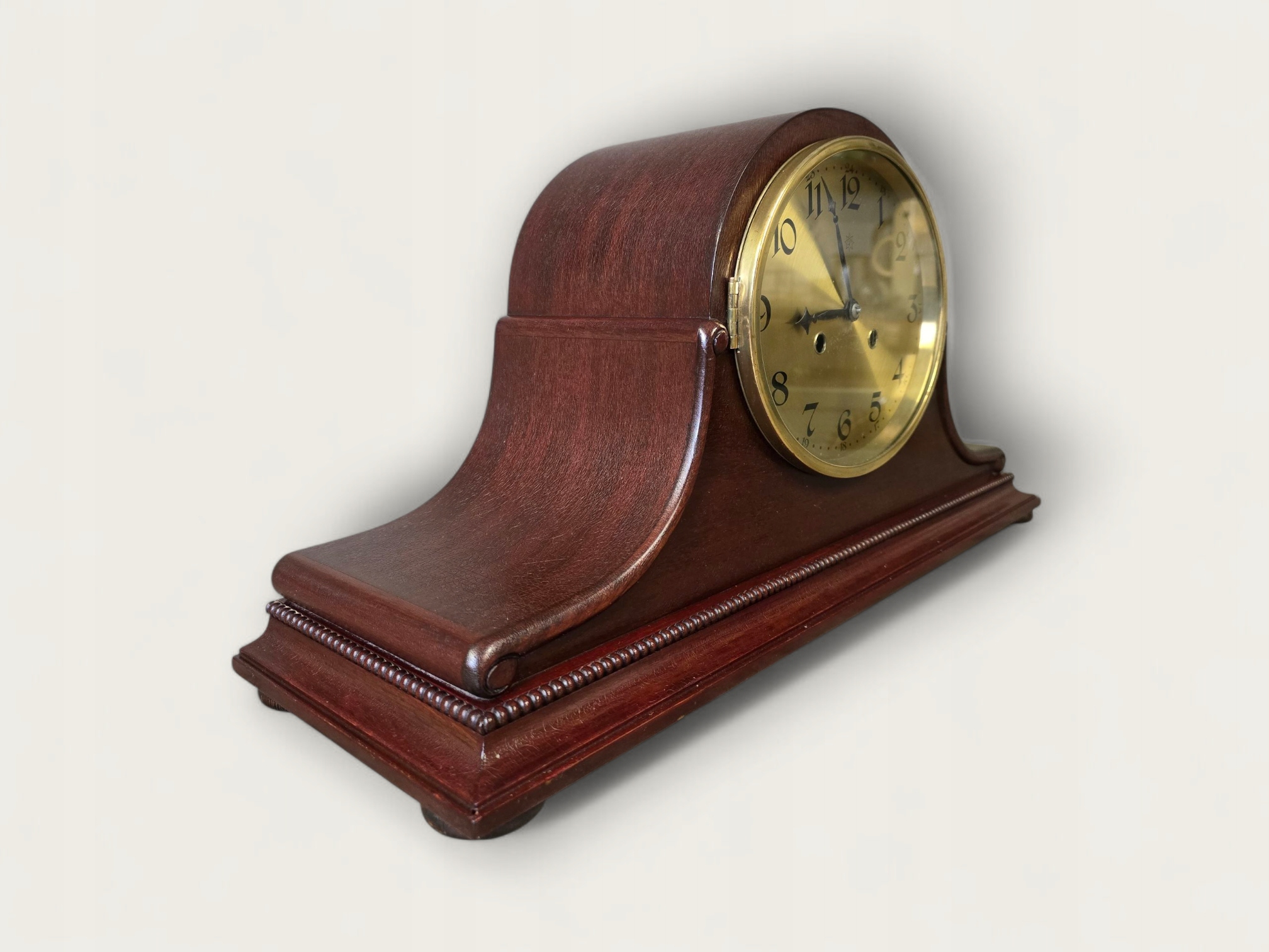 Предмет продажу - елегантний камінний годинник Junghans, виготовлений з червоного дерева, в характерному стилі Art Deco. У просторіччі цей тип годинника називають "Наполеон" через форму коробки, що нагадує капелюх Наполеона.