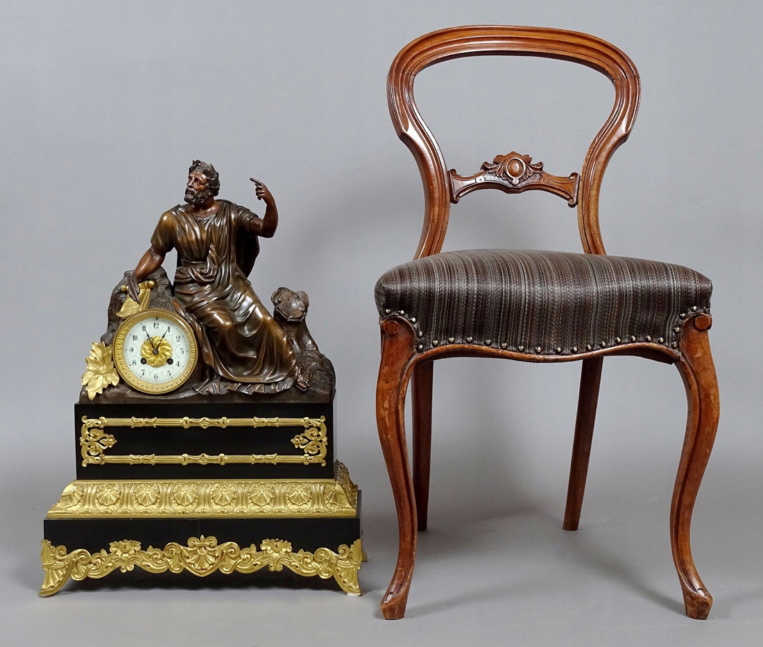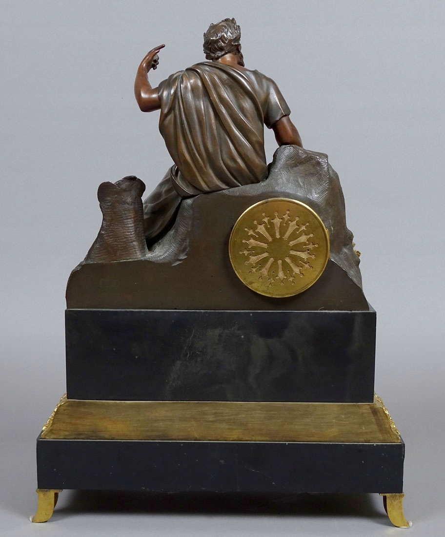 на прямокутній основі, прикрашеній внизу аплікацією з позолоченої бронзи у вигляді вусиків рослин . Зверху п’єдестал із чорного мармуру, оточений з трьох боків позолоченою смугою та тонкою аплікацією спереду, також позолоченою. Угорі зображено Платона, який сидить на уламку скелі з лавровим вінком на голові. У правій руці він тримає стилус, яким написав на дощечці вислів «Oui l'âme est immortelle» або «Так, душа людська безсмертна». Нижче — годинник із круглим, покритим склом циферблатом, чорними стрілками й арабським годинником. Пружинний механізм із годинною та півгодинною системою ударів, оригінальний ключ у комплекті.