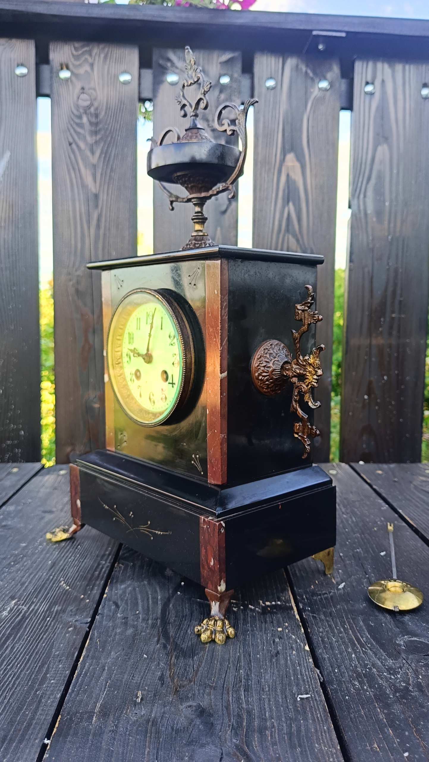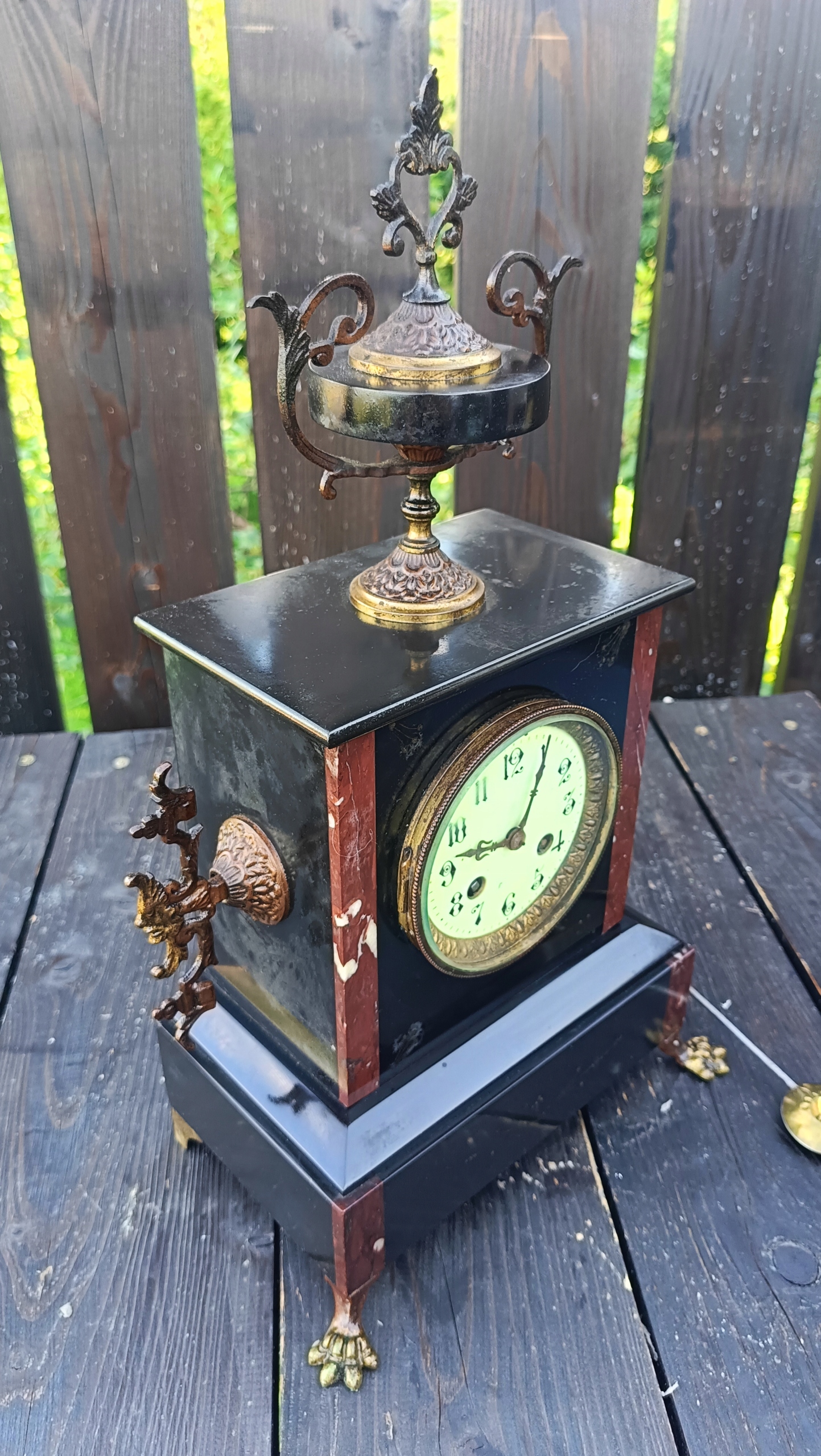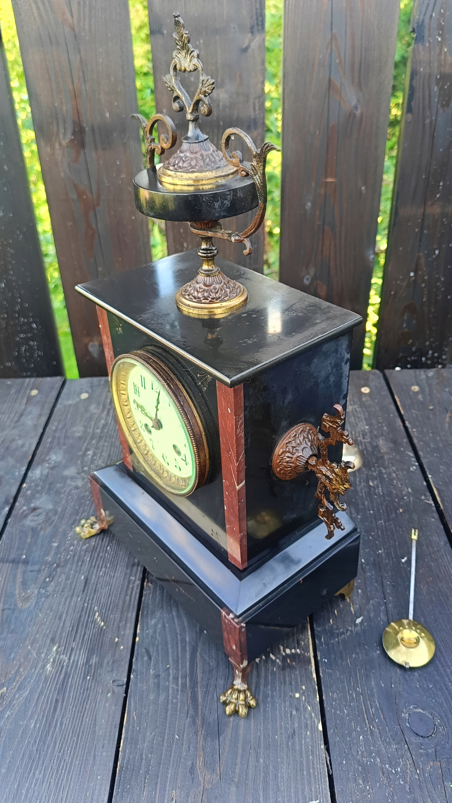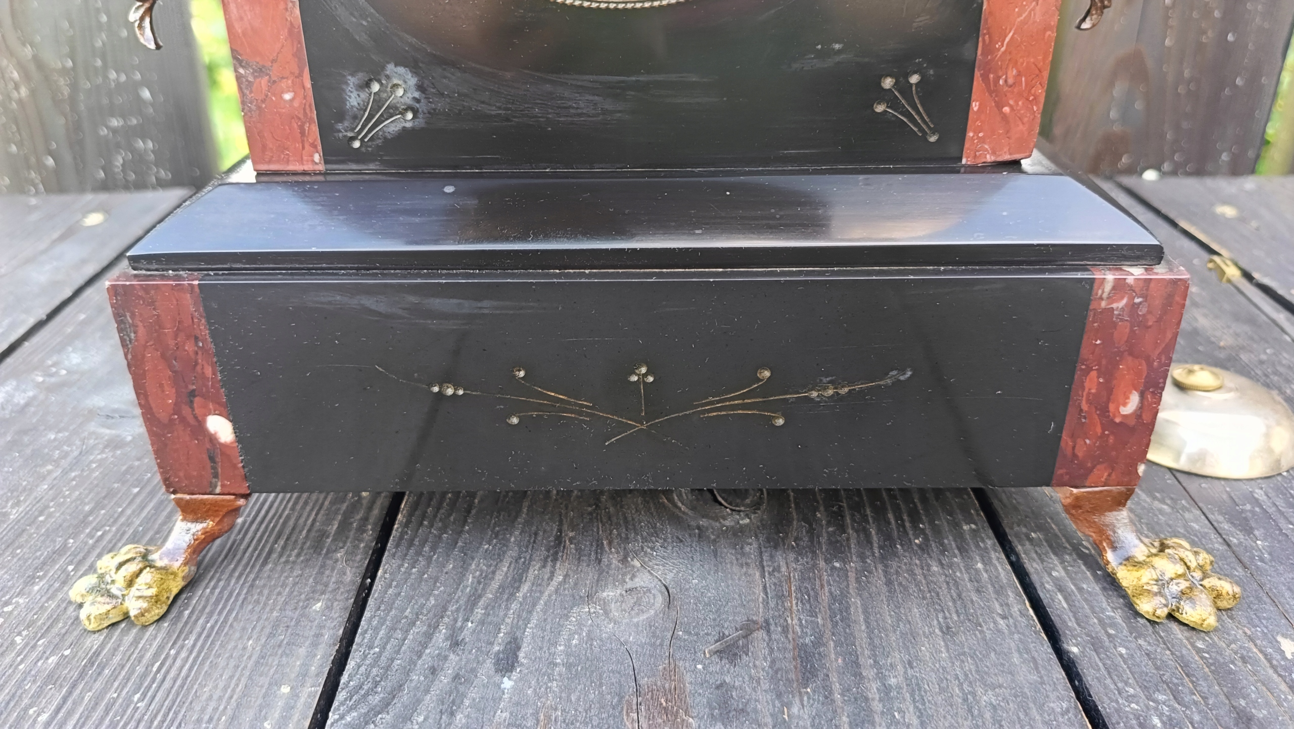 годинник, виготовлений з бронзи та мармуру з глибоким чорним кольором з вставками з червоного мармуру.