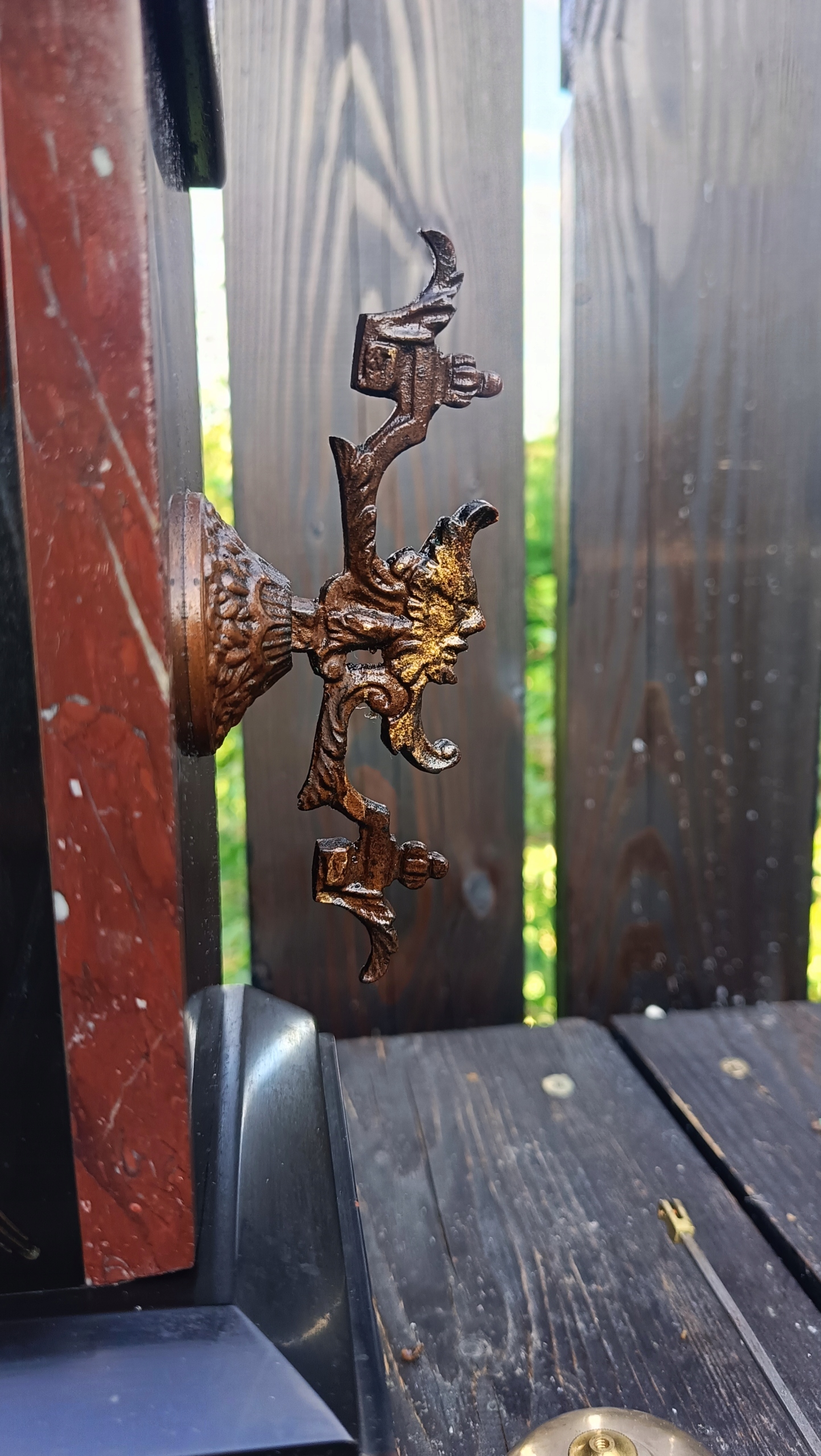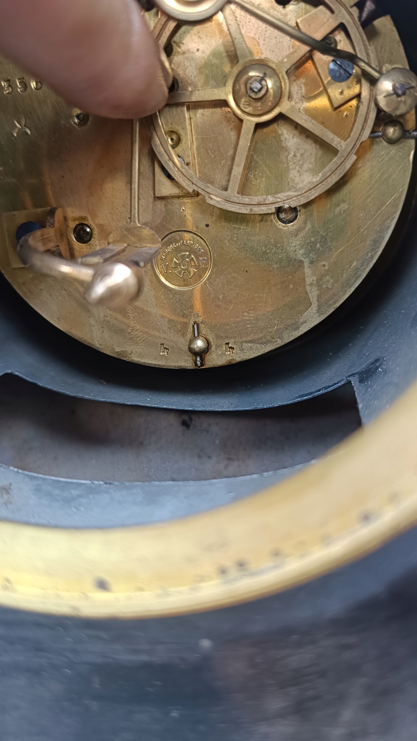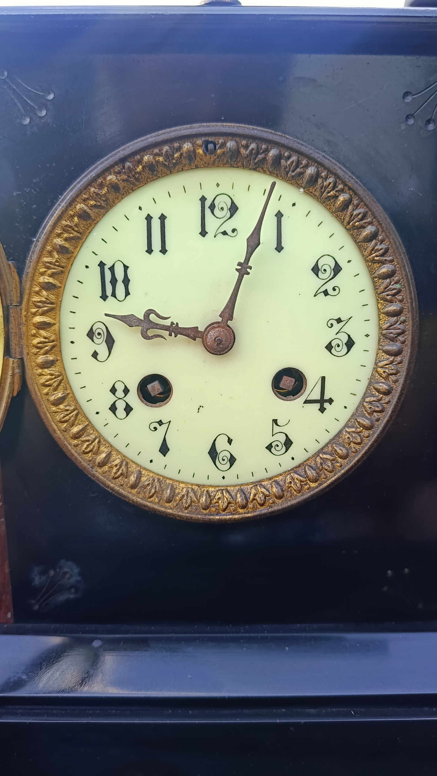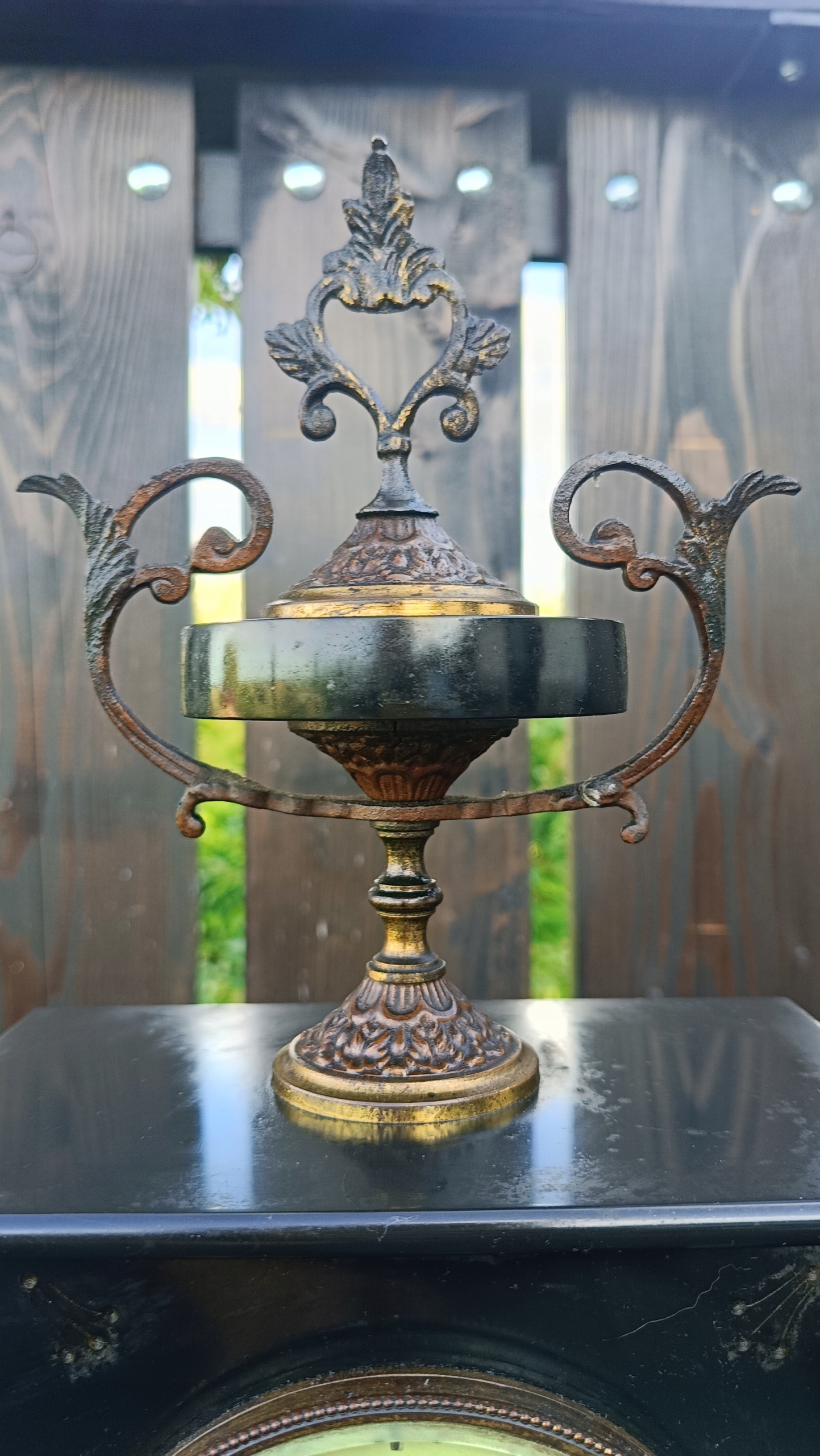 годинник, виготовлений з бронзи та мармуру з глибоким чорним кольором з вставками з червоного мармуру.