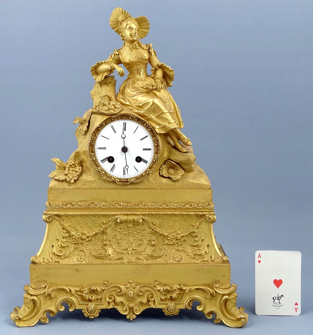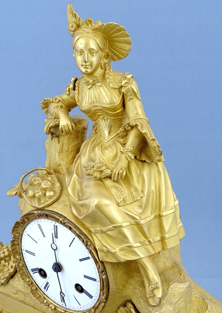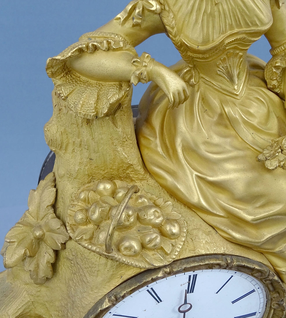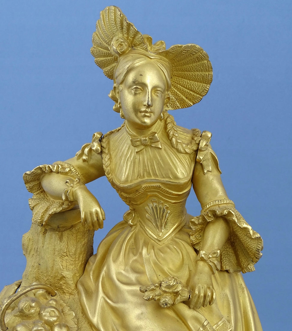 з позолоченої та патинованої бронзи, з ширшою основою, гравіюванням у вигляді вусиків рослин, що підтримується на чотирьох ніжках, з акцентами з листя і квітів аканта. Зверху фігура жінки в капелюшку на голові, ошатному вбранні та букеті квітів у лівій руці, а друга рука спирається на стовбур дерева, під яким стоїть кошик з яблуками.