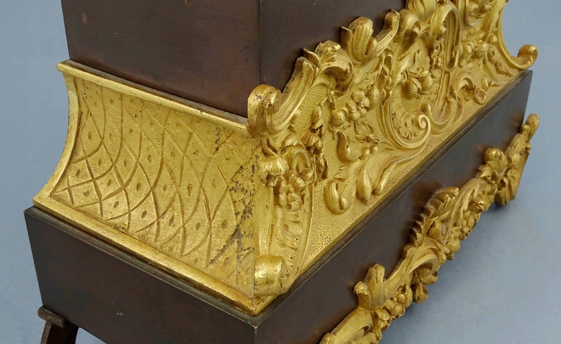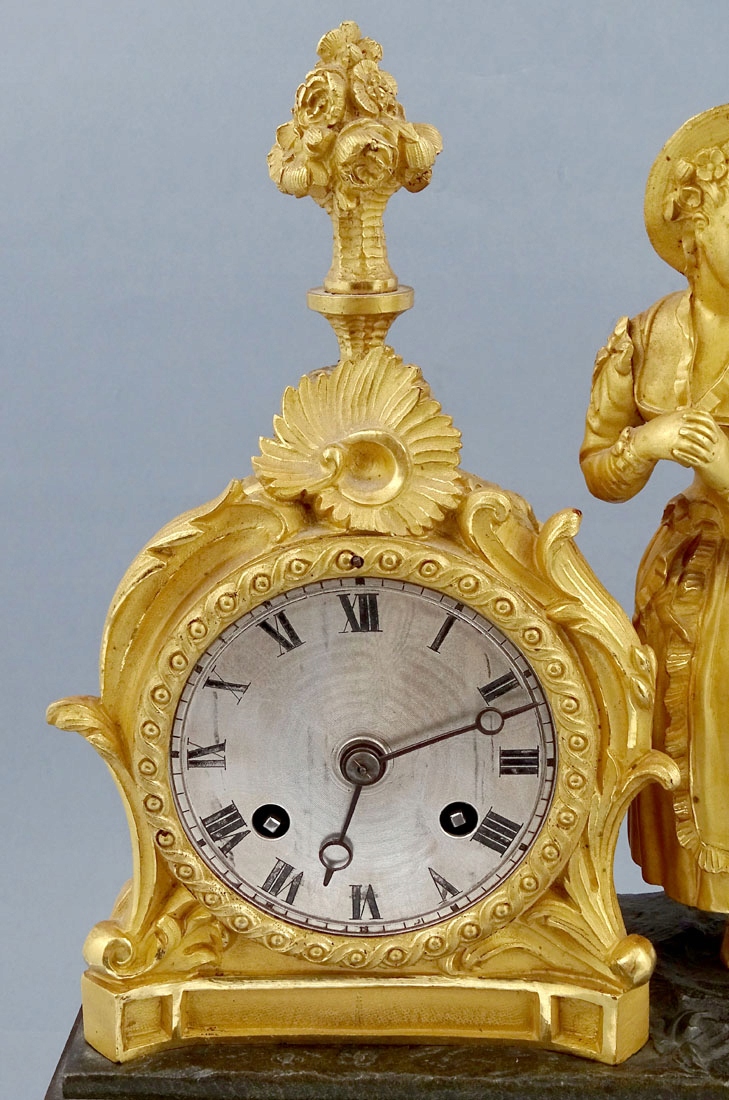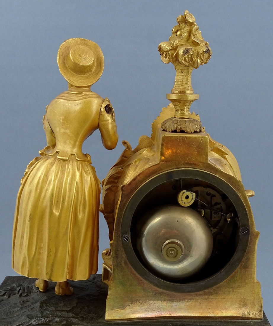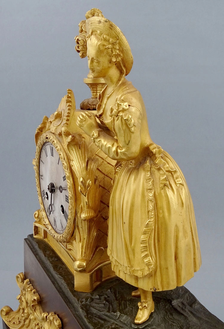 з прямокутною основою, оздоблений рокайлевими мотивами та листям аканта, з чотирма ніжками по кутах. Тулуб спереду прикрашений аплікаціями у вигляді вусиків рослин, а з боків - тонкими ромбиками. Зверху в подібній композиції розміщено годинниковий механізм і повністю пластична фігура елегантної дами з капелюшком на голові та розвіяною сукнею. Циферблат із почорнілими римськими цифрами години та хвилинною шкалою. Механізм із системою відбивання повної та півгодини, з маятником, підвішеним на нитці, сталевим дзвоном, заводним ключем у комплекті.