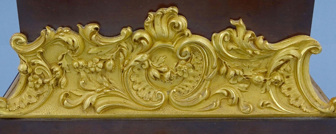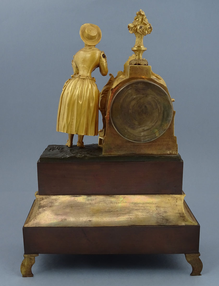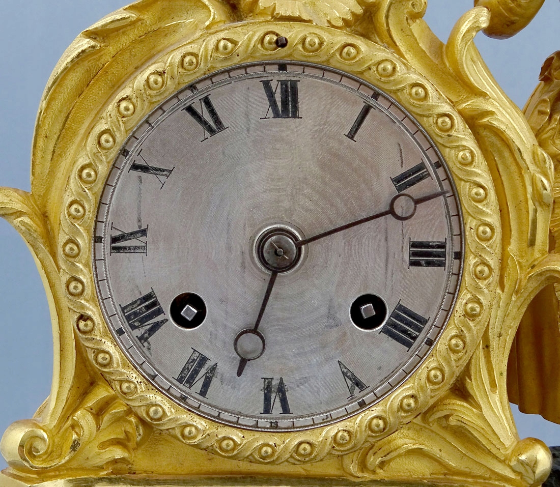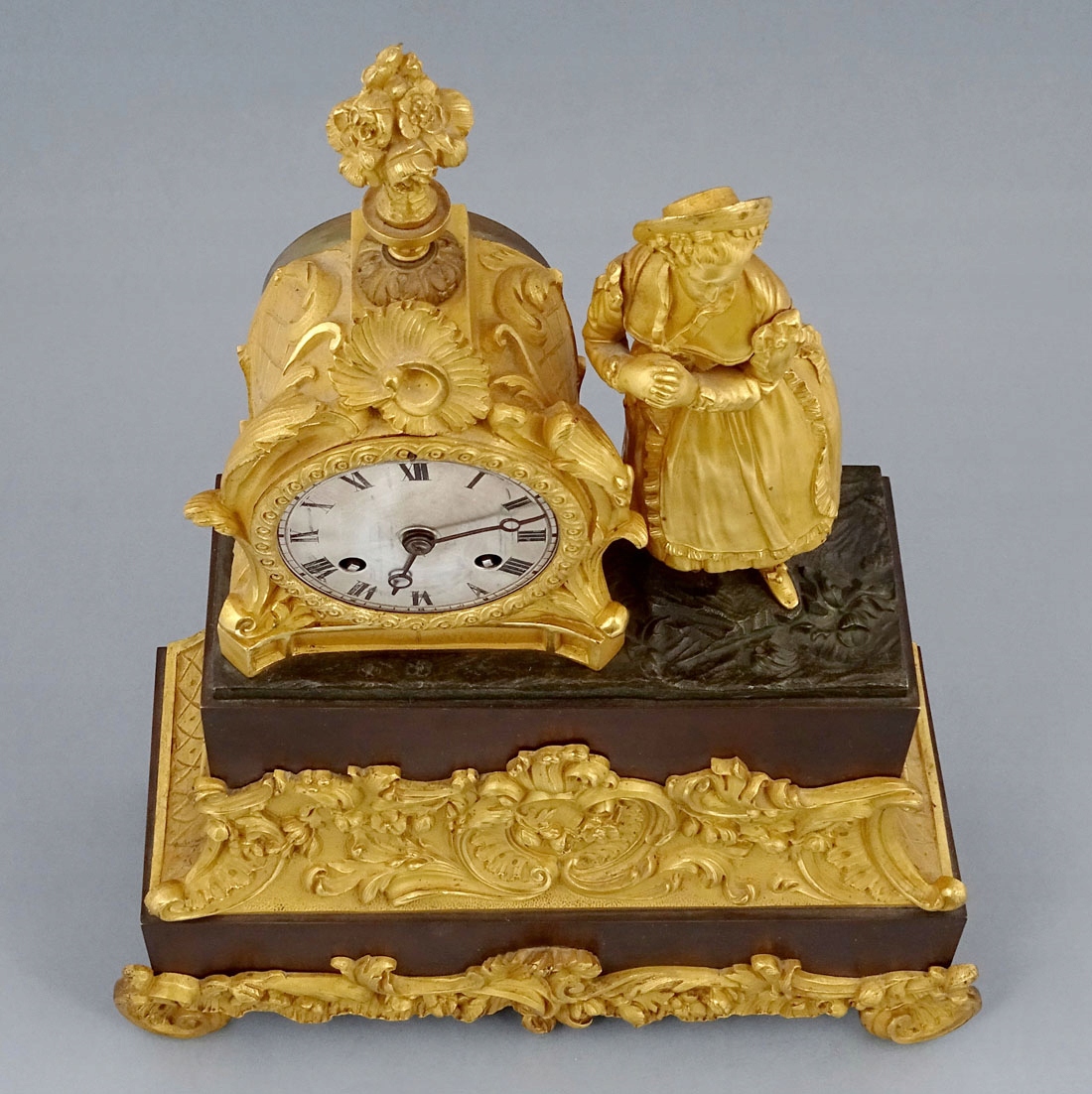 з прямокутною основою, оздоблений рокайлевими мотивами та листям аканта, з чотирма ніжками по кутах. Тулуб спереду прикрашений аплікаціями у вигляді вусиків рослин, а з боків - тонкими ромбиками. Зверху в подібній композиції розміщено годинниковий механізм і повністю пластична фігура елегантної дами з капелюшком на голові та розвіяною сукнею. Циферблат із почорнілими римськими цифрами години та хвилинною шкалою. Механізм із системою відбивання повної та півгодини, з маятником, підвішеним на нитці, сталевим дзвоном, заводним ключем у комплекті.