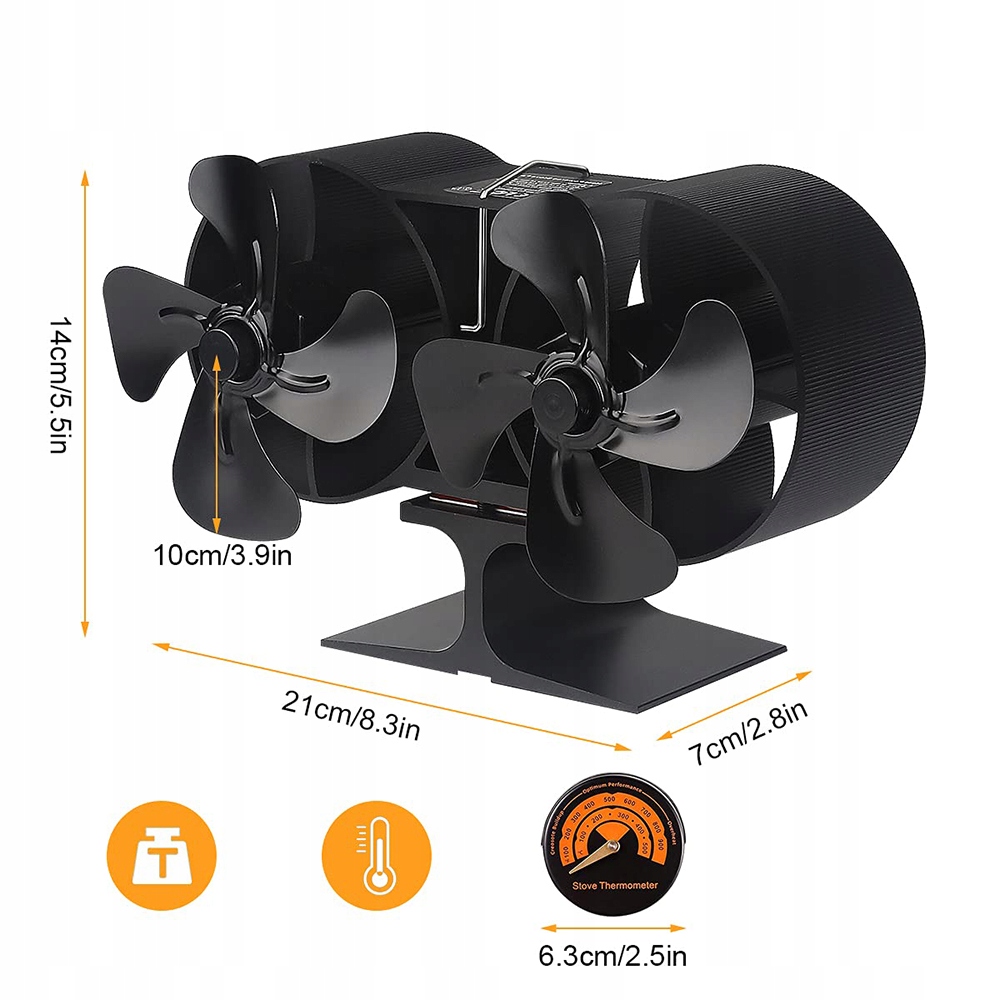 Вентилятор для гарячого повітря з подвійним двигуном і 8 лопатями для отримання більше теплого повітря та підвищення ефективності продукту. Широко використовується в дров’яних печах, газових плитах, дров’яних печах, камінах тощо.