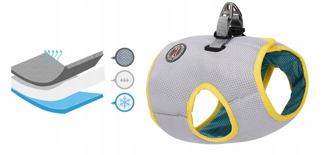 Його потрійний шар спеціально підібраних матеріалів забезпечує достатню циркуляцію повітря, змушуючи вологу випаровуватися та забезпечує охолоджуючий ефект, який передається на все тіло тварини.