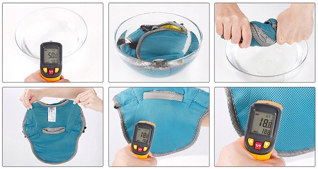 - Центральна тривимірна сітчаста тканина, з якої виготовлений жилет, спрямовує повітряний потік, змушуючи охолоджуючий шар належним чином відводити воду та охолоджувати собаку.