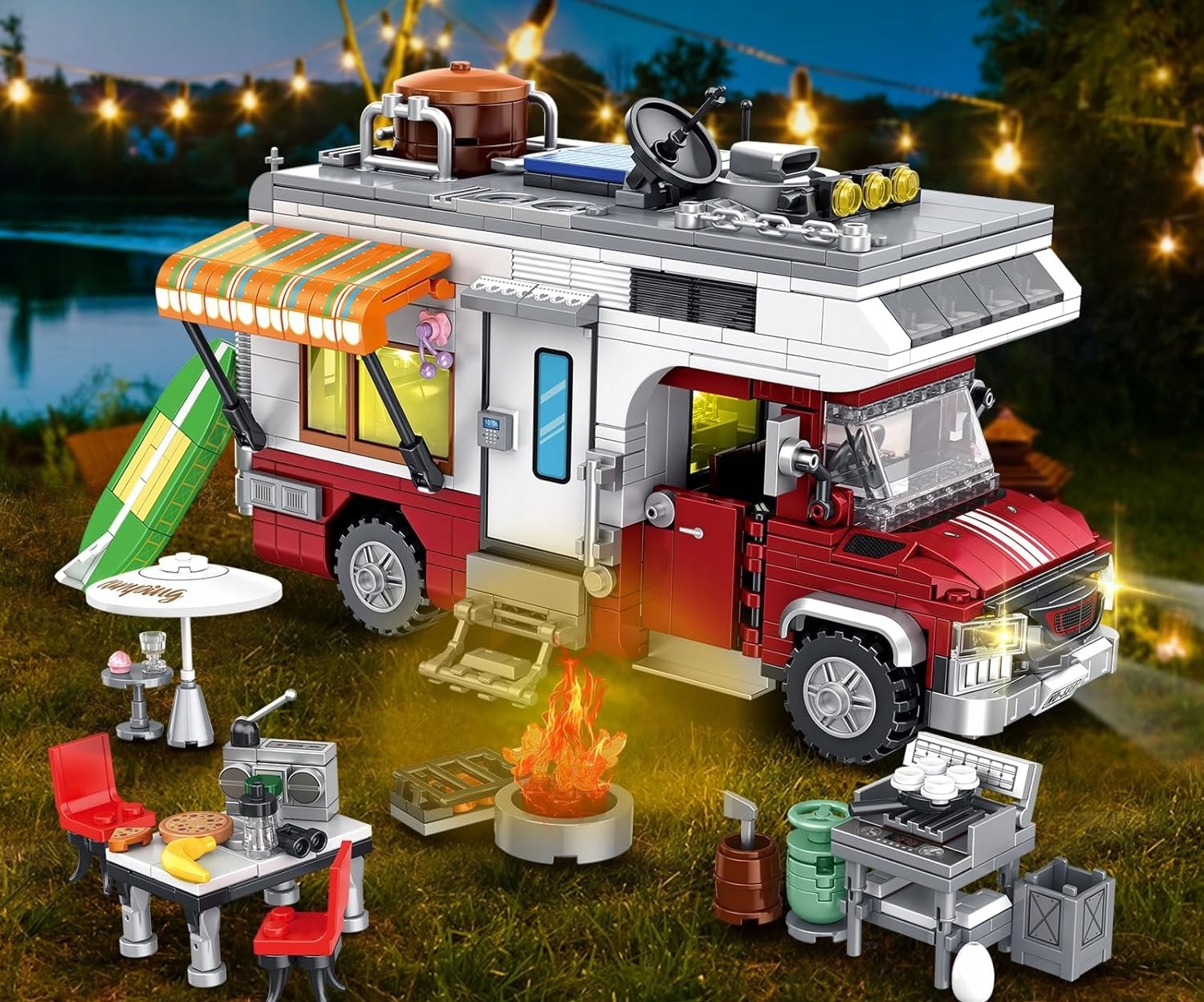 ✨ Великий святковий кемпер, повний авантюрного кемпінгу - набір структурних блоків 880 елементів✨ освітлена кабіна!