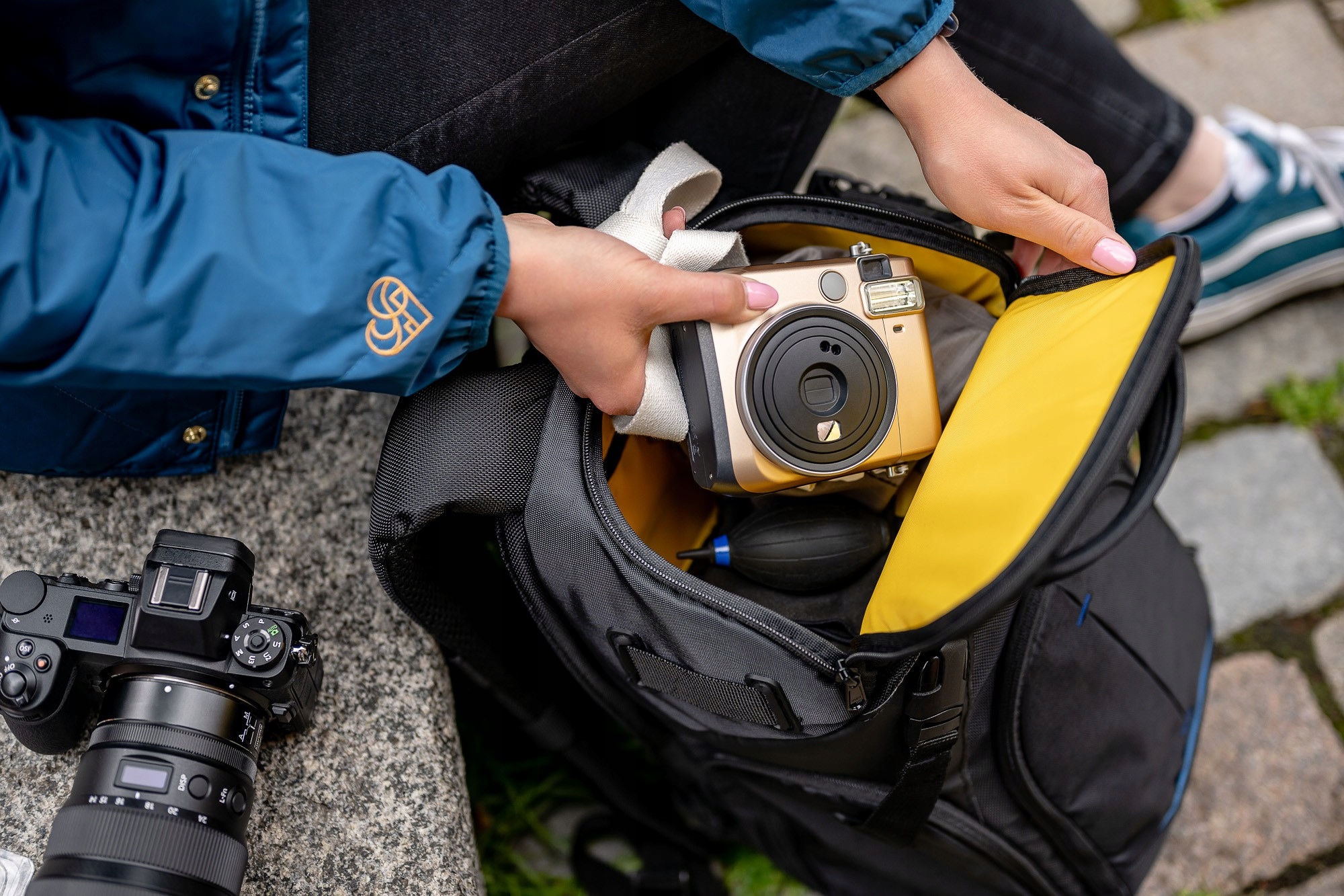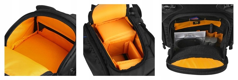 Рюкзак оснащений основною камерою та двома кишенями, передньою та верхньою. Основна камера вміщує дзеркальну камеру з об'єктивом (також з телефотозним об'єктивом), додаткові 2-3 лінзи, спалах, запасний корпус. Передня кишеня ідеально підходить для зберігання аксесуарів, таких як фільтри, скорочення та запасні батареї. У верхній кишені ми можемо приховати обід, додатковий одяг або також фотографічне обладнання (воно вміщує, наприклад, два лінзи або спалах).