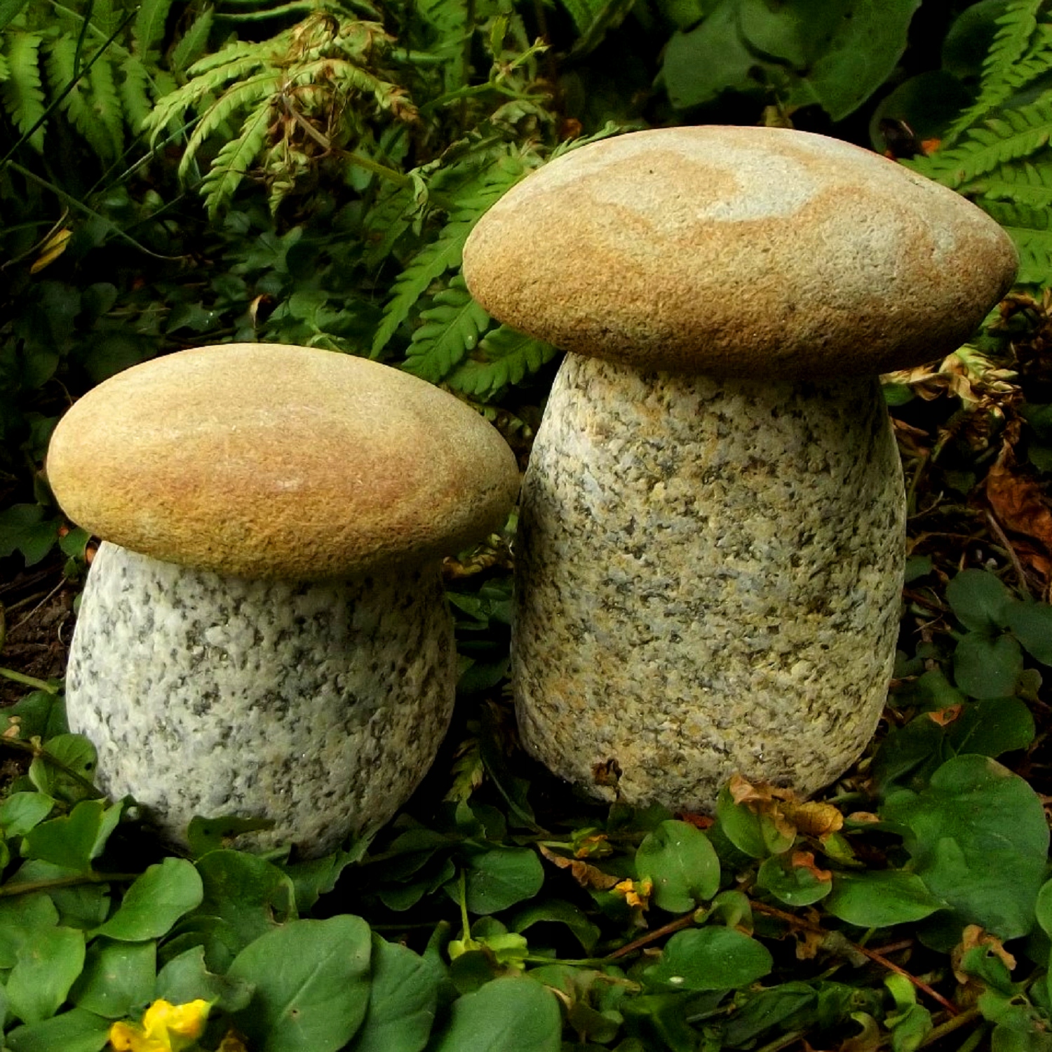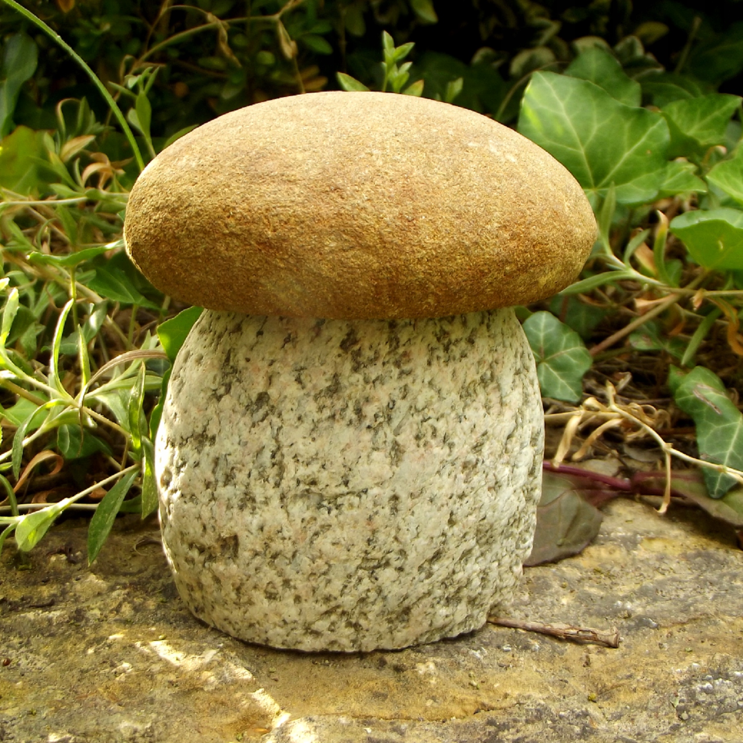 Гриб з натурального каменю, граніту. Фігурки міцні і стійкі до погодних умов, можуть зимувати в саду. Форма кісточок, сформована природою, робить кожен гриб унікальним. Розміщені в саду під туями, хвойними деревами, на рокарії або корі, вони виглядають як справжні.