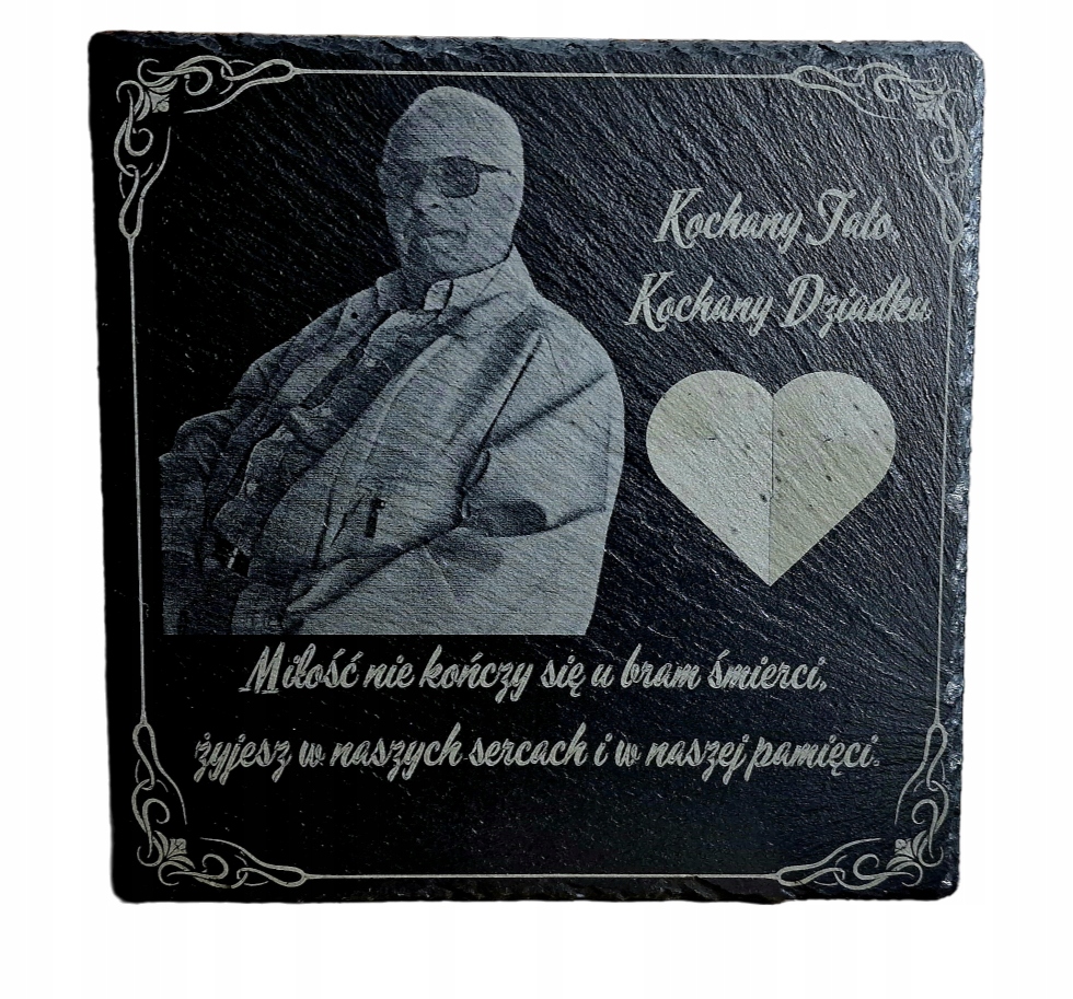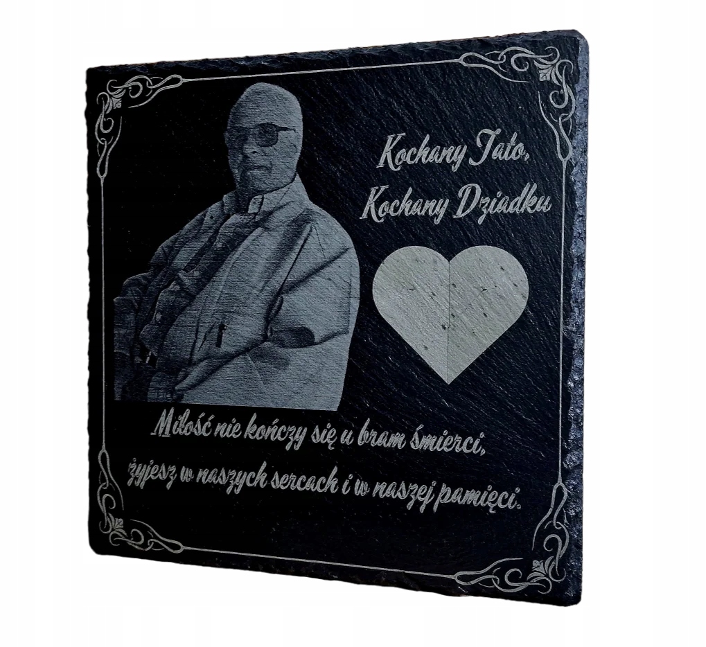 Ми використовуємо міцний та естетичний матеріал - шифер, який надає табличці неповторного характеру. Це камінь, який прослужить роками, зберігаючи свою красу. Ви можете вибрати фотографію, яка має для вас особливе значення, і ми випалимо її на табличці, створивши незвичайний сувенір. Крім того, ви можете додати будь-який текст, який виражатиме ваші почуття, думки чи відданість.