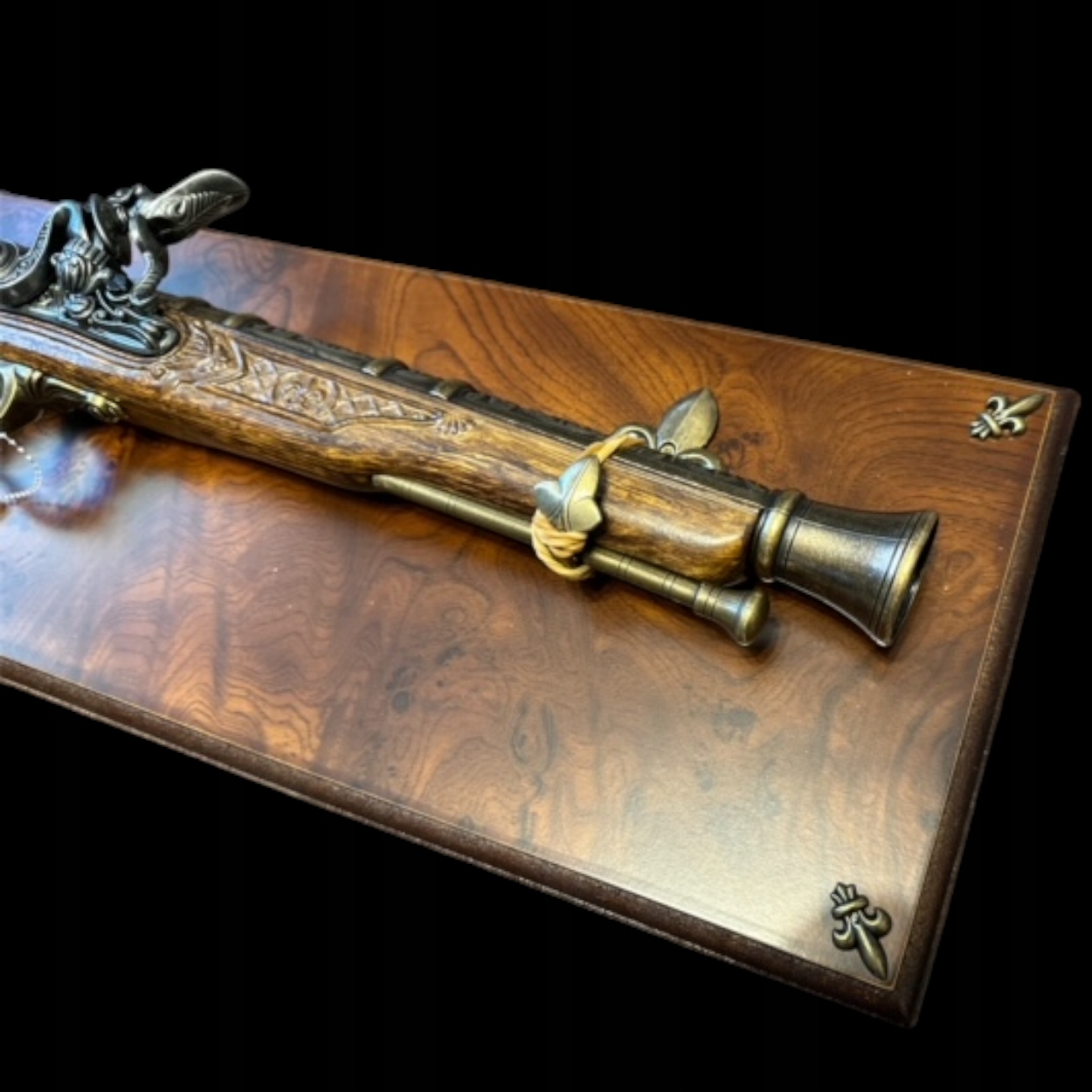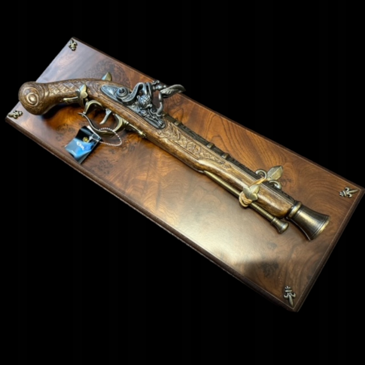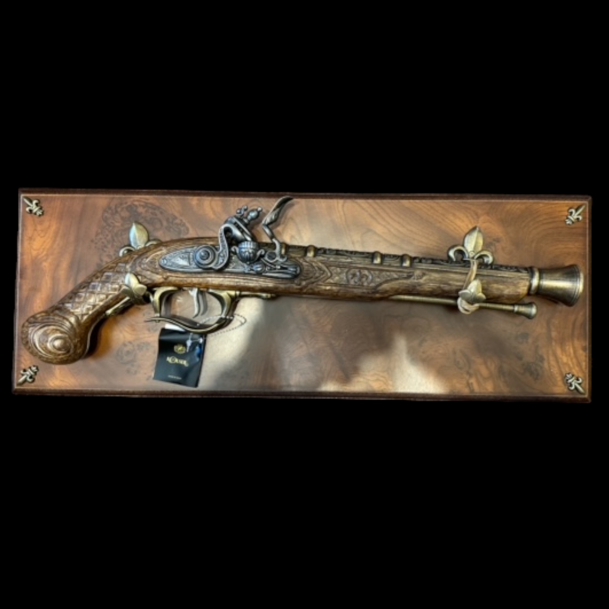 Перед вами мисливський кремневий пістолет. Свого часу крем'єві пістолети були поширені, тому їх використовували і під час полювання. Пізніше їм прийшов кінець, як і іншим видам зброї, яким довелося поступитися місце більш досконалим моделям - револьверам і ударним пістолетам. Красива копія мисливського кремневого пістолета, яку ви отримаєте разом із витонченим столиком, неодмінно поповнить вашу колекцію.