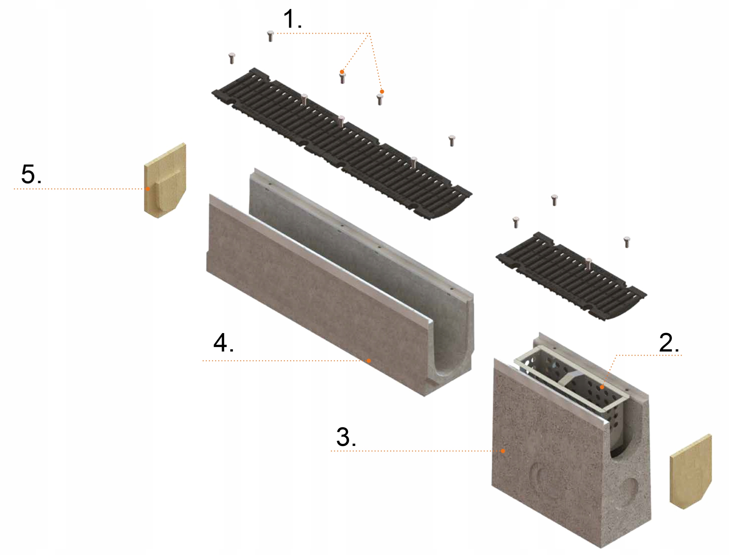 бетон (канали) з чавунною решіткою для відтоків води (зневоднення) громадськості, внутрішніх доріг, стоянки, садів, гаражів, домашніх підйомів та всіх інших місць, де є сильний рух. Традиційний бетонний довговічний дизайн забезпечує сміття, безпроблемні збірки та експлуатацію