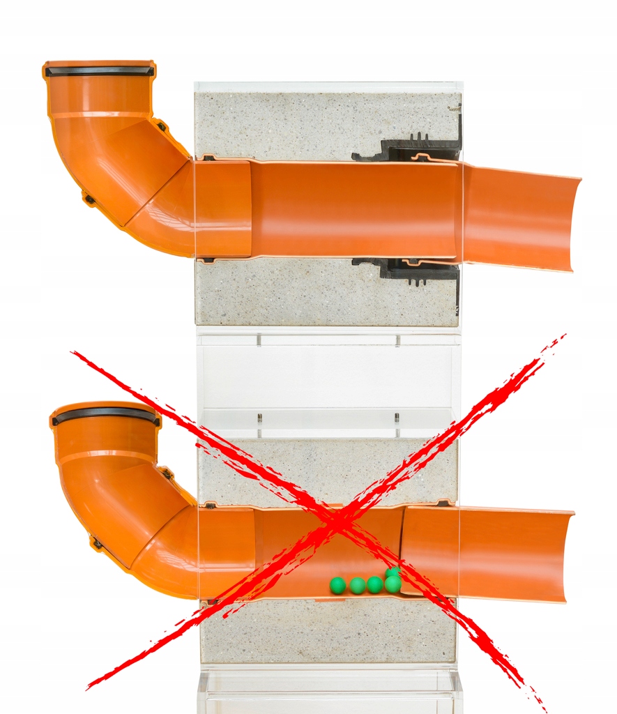 Оптимальний потік через водопропускну трубу – запобігає засміченню каналізаційної системи. Завдяки своїй унікальній конструкції він дозволяє перетворювати звичайні каналізаційні труби в стінові водопропускні труби, підігнані під товщину стіни, безпосередньо на будівельному майданчику. Додатково також доступна у заводській версії, адаптованій до товщини стінки.