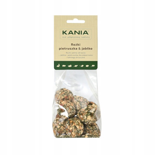 Шишки KANIA зі смаком петрушки та яблука - надзвичайно ароматна та натуральна закуска, створена для кроликів та гризунів. Поєднання соковитого яблука з інтенсивним, свіжим ароматом петрушки робить шишки не тільки смачними, але й насиченими поживними цінностями, які підтримують здорову дієту для вашого улюбленця.