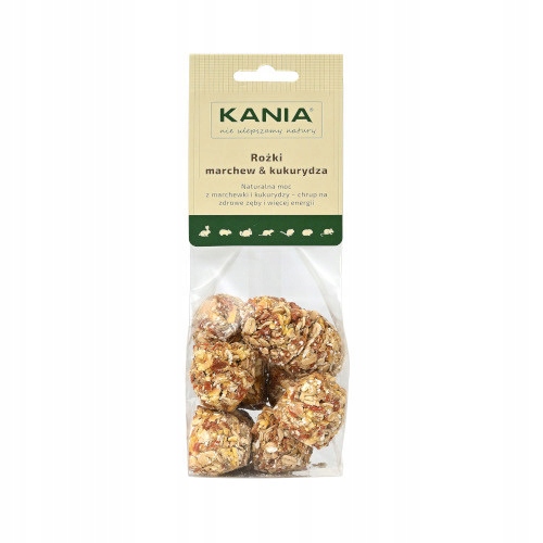Морквяно-кукурудзяні ріжки KANIA - це смачна, хрустка закуска, створена для кроликів і гризунів, які люблять натуральні ласощі. Це поєднання легкої кукурудзи та ароматної моркви створює винятково привабливий смак та запах, спонукаючи тварин кусатися та підтримуючи їхню природну потребу сточувати зуби.