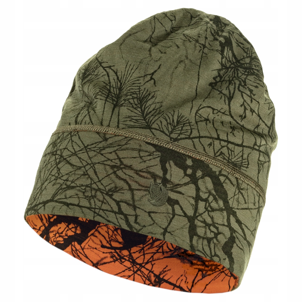 Легка двостороння мисливська шапка з простежуваної вовни та поліестеру. Зелений камуфляжний принт з одного боку та чітко помітний помаранчевий камуфляжний принт з іншого боку. Легко зберігати і носити цілий рік.