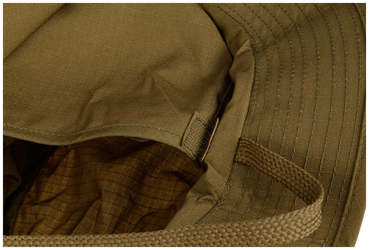 Ззаду він має накриття для шиї, яке кріпиться за допомогою липучок і може бути повністю від'єднано від капелюха, якщо це необхідно.