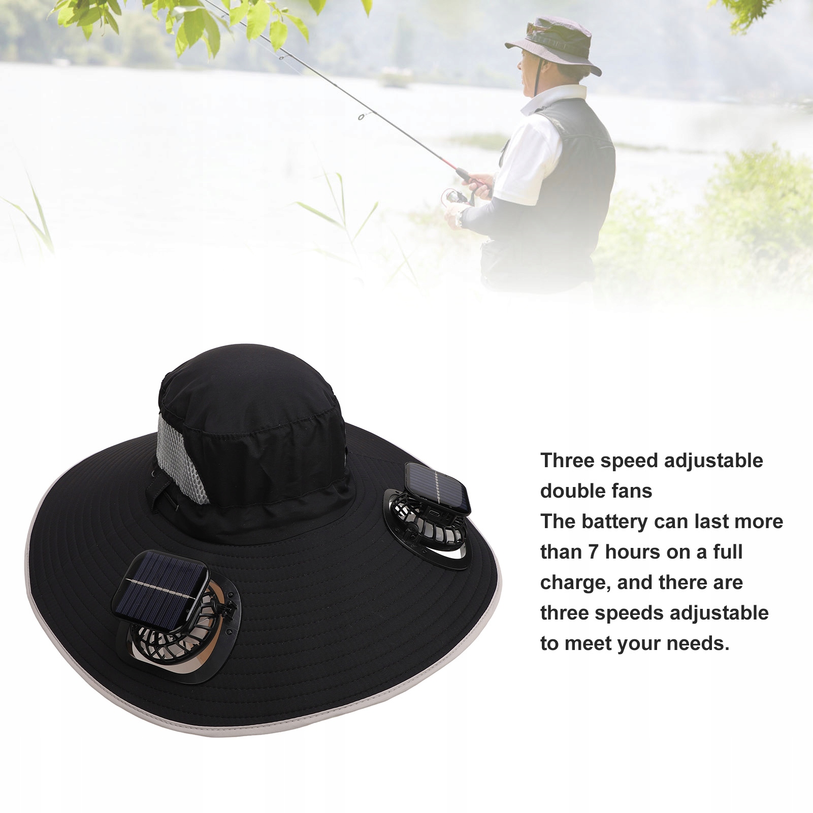 1. СОНЯЧНИЙ ВЕНТИЛЯТОР: вентилятор безперервно обертається під дією прямого сонячного світла та не обертається, коли сонячного світла немає. Ця конструкція дозволяє капелюху автоматично створювати прохолодний вітерець на вулиці, підвищуючи комфорт користувача.