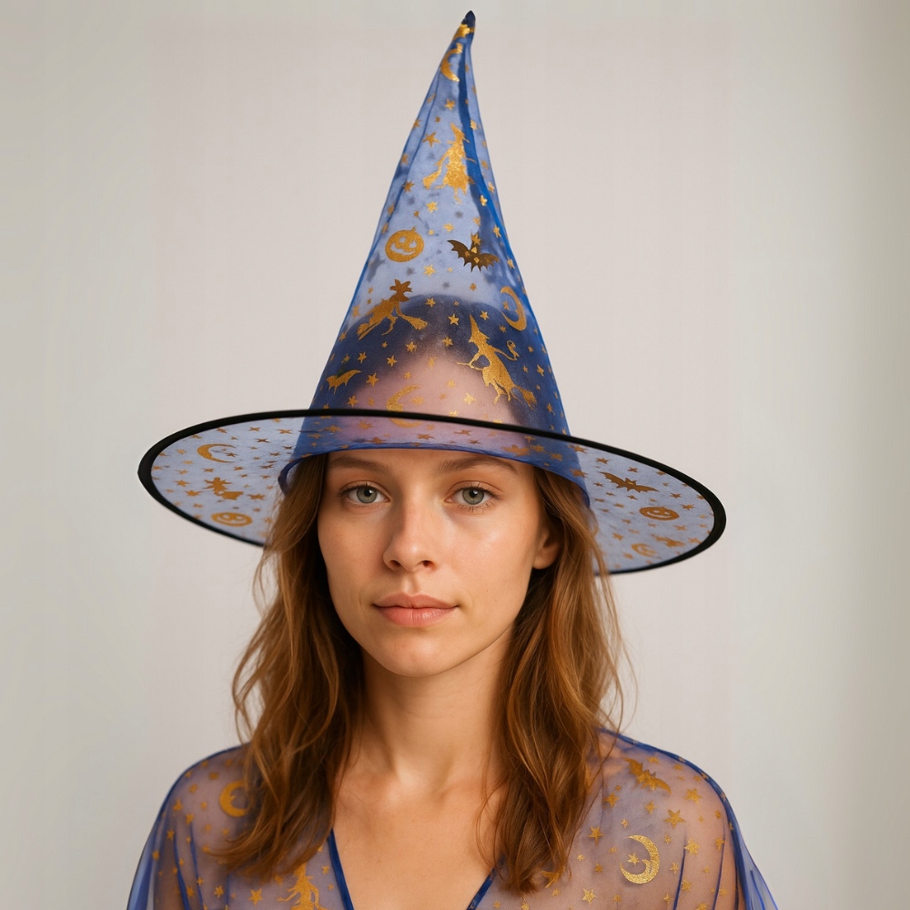 ✨ Завдяки своєму вражаючому зовнішньому виглядувін зробить ваш костюм ще більш унікальним. Прозорий блакитний матеріал з привабливими золотими принтами, завдяки цьому капелюху ви створите чарівний і неповторний образ, який порадує всіх учасників вечірки!