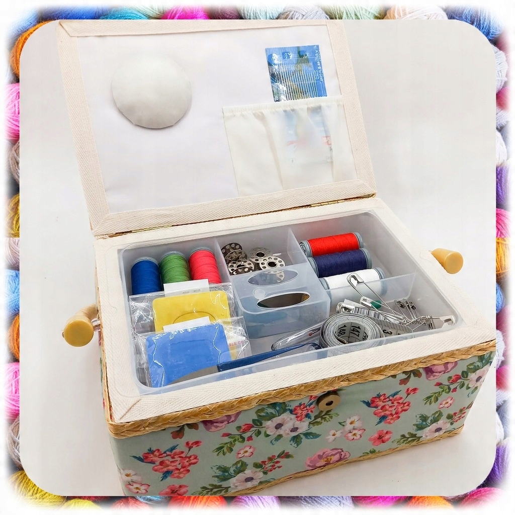 прозорий організатор з 4 відділеннями - на потоках, кнопках, голках, високих підборах. Під ним - глибока камера, яка вміщує ножиці, більші котушки, заходи чи інші інструменти.