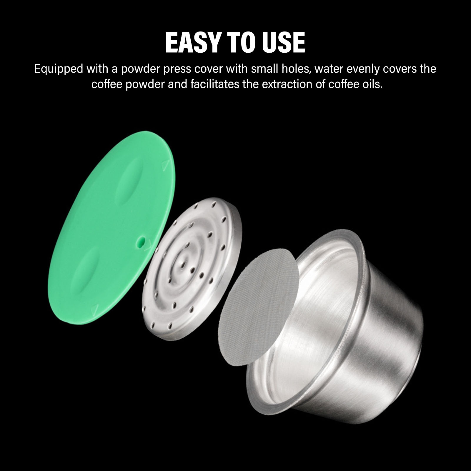 5. Простота у використанні: просто використовуйте ложку, щоб транспортувати чашку кави до капсули. Оснащений пресом для кави з маленькими отворами, вода рівномірно покриває кавову чашку та полегшує екстрагування кавової олії.