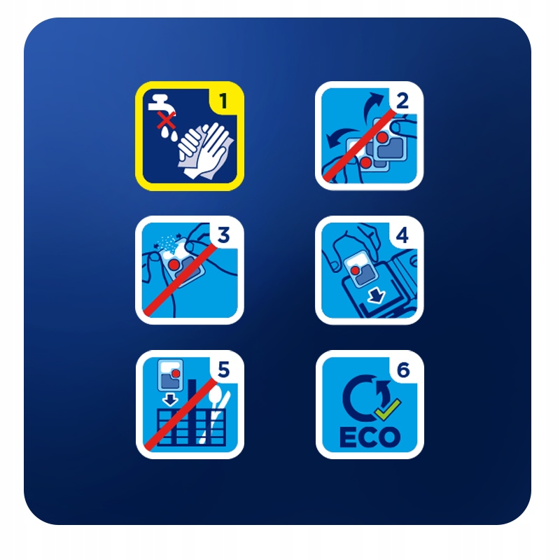 Удосконалена формула ефективно видаляє навіть пригорілі залишки їжі - без попереднього полоскання, забезпечуючи аж 4 різні дії в циклі миття. Зникає навіть найсильніший бруд. Капсули захищають і доглядають за склом і столовими приборами, зберігаючи їх блиск після кожного миття. Крім того, вони захищають фільтри посудомийної машини та запобігають утворенню вапняного нальоту.