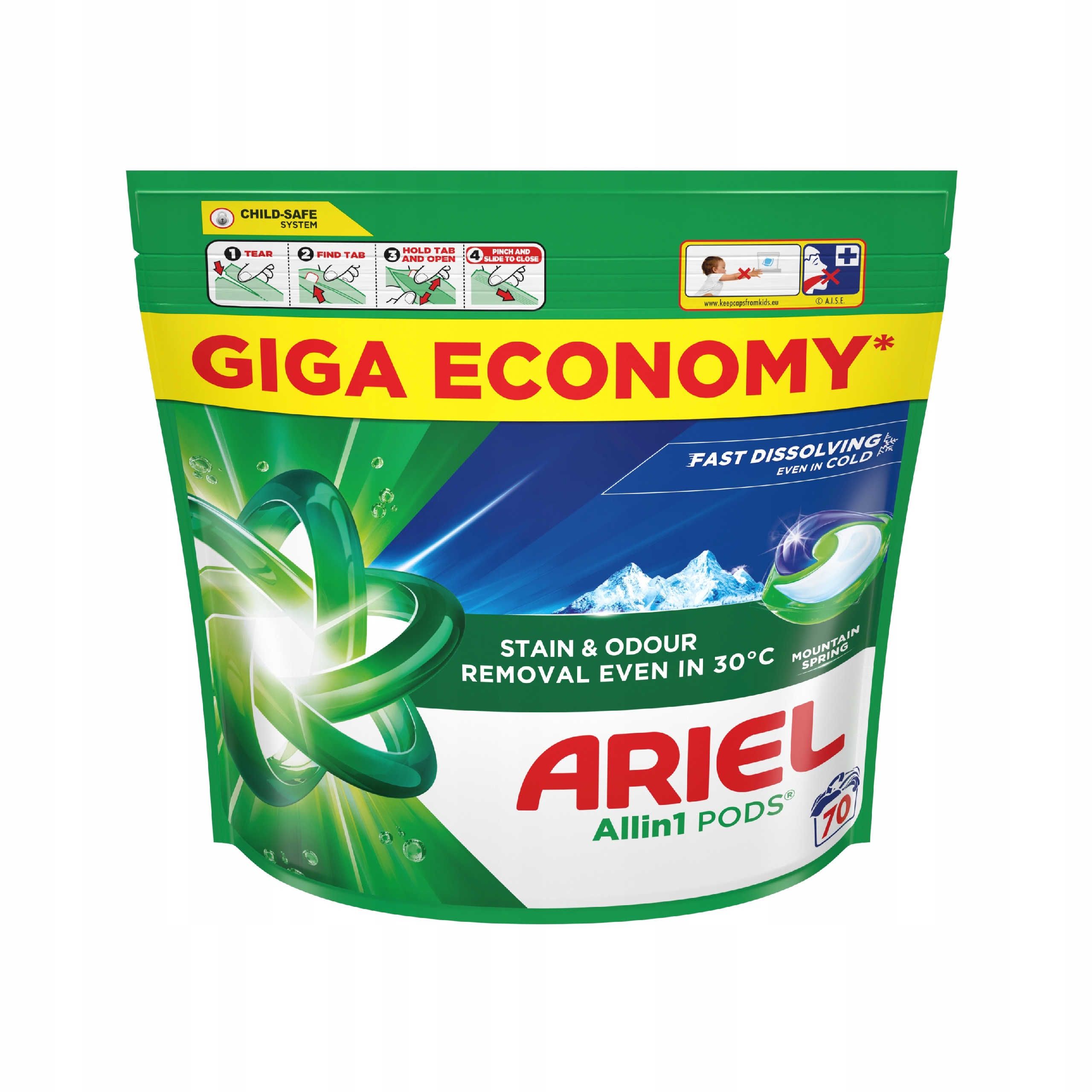 Ariel Allin1 Mountain Spring Капсули для прання 70 шт. Кольорові пральні капсули Ariel All-in-1 забезпечують чудові результати видалення забруднень навіть за низьких температур. Це виняткова сила прання в одній капсулі. Формула, заснована на кількох агентах, забезпечує відмінні результати прання навіть при низьких температурах. Відбілюючі капсули Ariel ефективно видаляють плями, доглядають за одягом і дарують йому свіжий, чистий аромат.