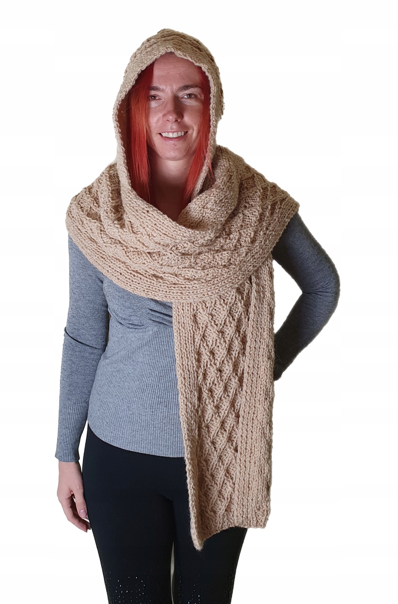Шарф-капюшон ручної в'язки з пряжі: 20% вовни та 80% акрилу.