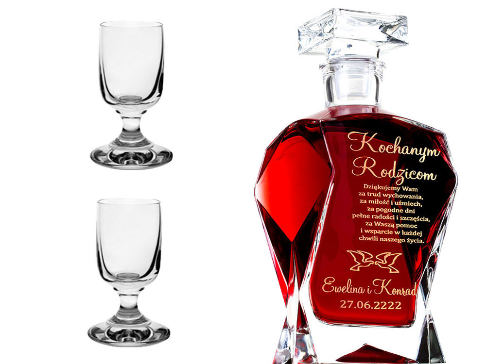 Чудовий скляний графин ручної форми, який робить кожен унікальним та унікальним. Збоку має спеціальний ламаний малюнок, який підкреслює, що графин виглядає дуже дорого. Він чудово виглядає завдяки своїй інноваційній формі, що забезпечує незабутнє естетичне та візуальне враження. Продавець повідомляє, що графини виготовляються вручну на склозаводі і іноді можуть містити бульбашки повітря всередині скла та дрібні подряпини на поверхні, що є результатом виробничого процесу. Можу зробити для вас - ПОДАРУНОК НА БУДЬ-ЯКУ НАХОДУ (весілля, прийом, день народження, вісімнадцятиріччя, іменини, ювілей, річниця весілля, день батька, день дідуся тощо).