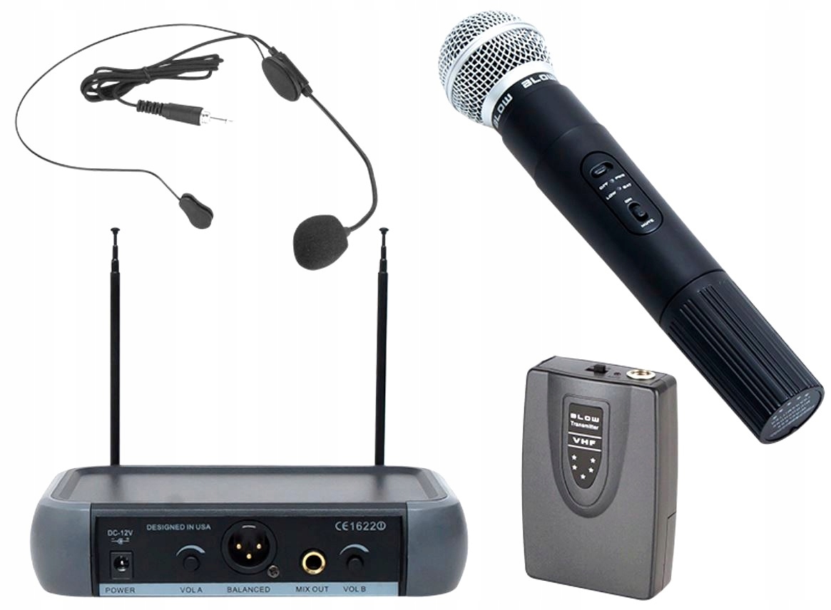Новий набір з двох бездротових мікрофонів BLOW, мікрофона-гарнітури та динамічного мікрофона, модель PRM-903, чорний, приймальна станція, передавач для мікрофона гарнітури, гніздо 6.3 мікрофонний кабель , Джерело живлення 12V 1A, 2 x 9V батареї, Оригінальна упаковка BLOW AUDIO Посібник користувача польською мовою