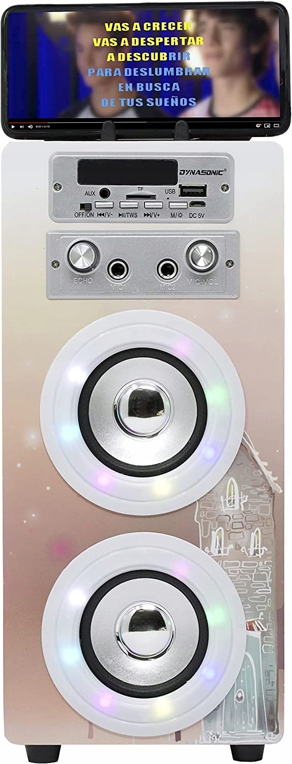 - з караоке-мікрофоном без будь-яких ускладнень. Наша портативна колонка Bluetooth має режим караоке, завдяки гніздам входу ви можете під’єднати мікрофон або обидва мікрофони (у комплекті колонки), щоб годинами співати улюблені пісні.