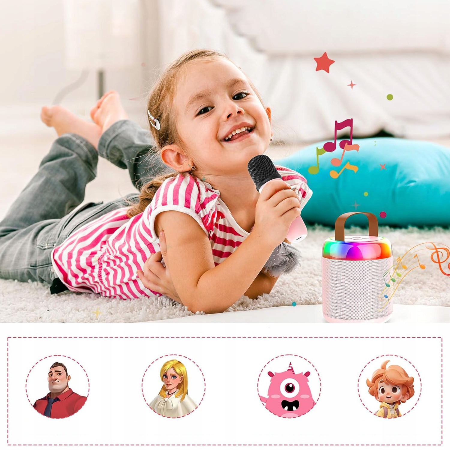 - Оснащений 4 чарівними звуковими ефектами, користувачі можуть легко перемикатися між різними голосами, зокрема чоловічим, жіночим, монстром і немовлям, забезпечуючи нескінченне задоволення для дітей.