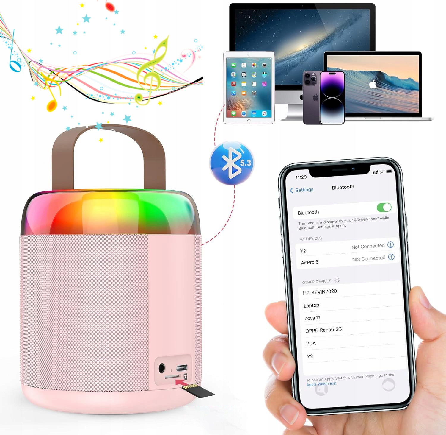 - Завдяки технології Bluetooth 5.3 ви також можете підключити свою караоке-машину до свого мобільного телефону чи планшета та відтворювати будь-яку музику з таких музичних програм, як Spotify, YouTube або Apple Music!