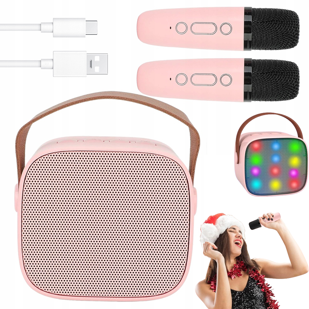 КАРАОКЕ З 2 МІКРОФОНАМИ BLUETOOTH 5.0 КОЛОНКА LED РОЖЕВА