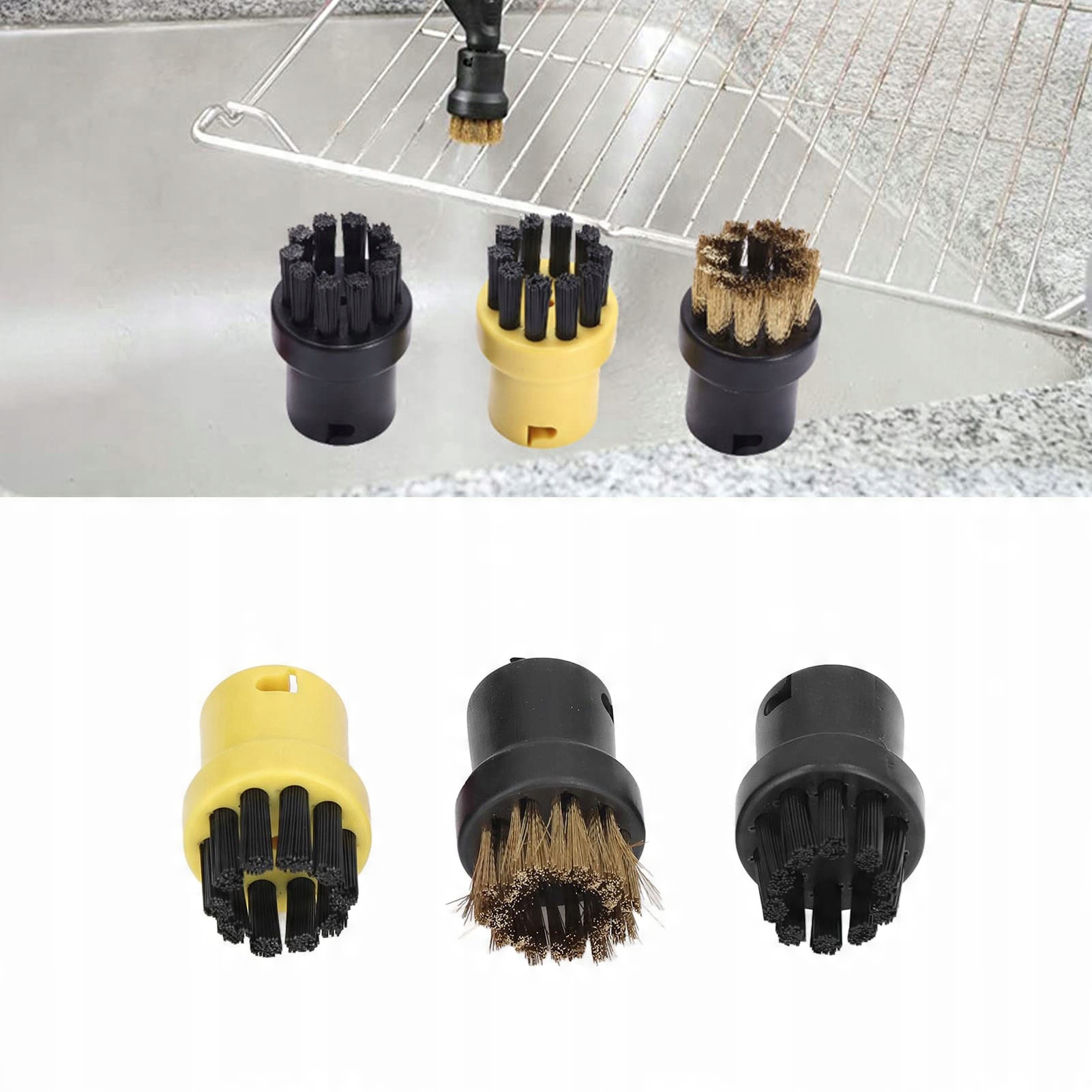 Кругла пензлик ідеально підходить для видалення стійкої бруду, особливо при очищенні кухні, очищення відтиків на кухні та ванній кімнаті, умивальники у ванній кімнаті та кухонній раковині, для очищення кранів, кутів, кутів та креверів. Силіконові суглоби уваги слід обережно очистити лише паровим потоком, щоб не пошкодити їх. Латунна пензлик ідеально підходить для видалення висушеного бруду, наприклад жир. Через твердість щетини її не слід використовувати на делікатних поверхнях.