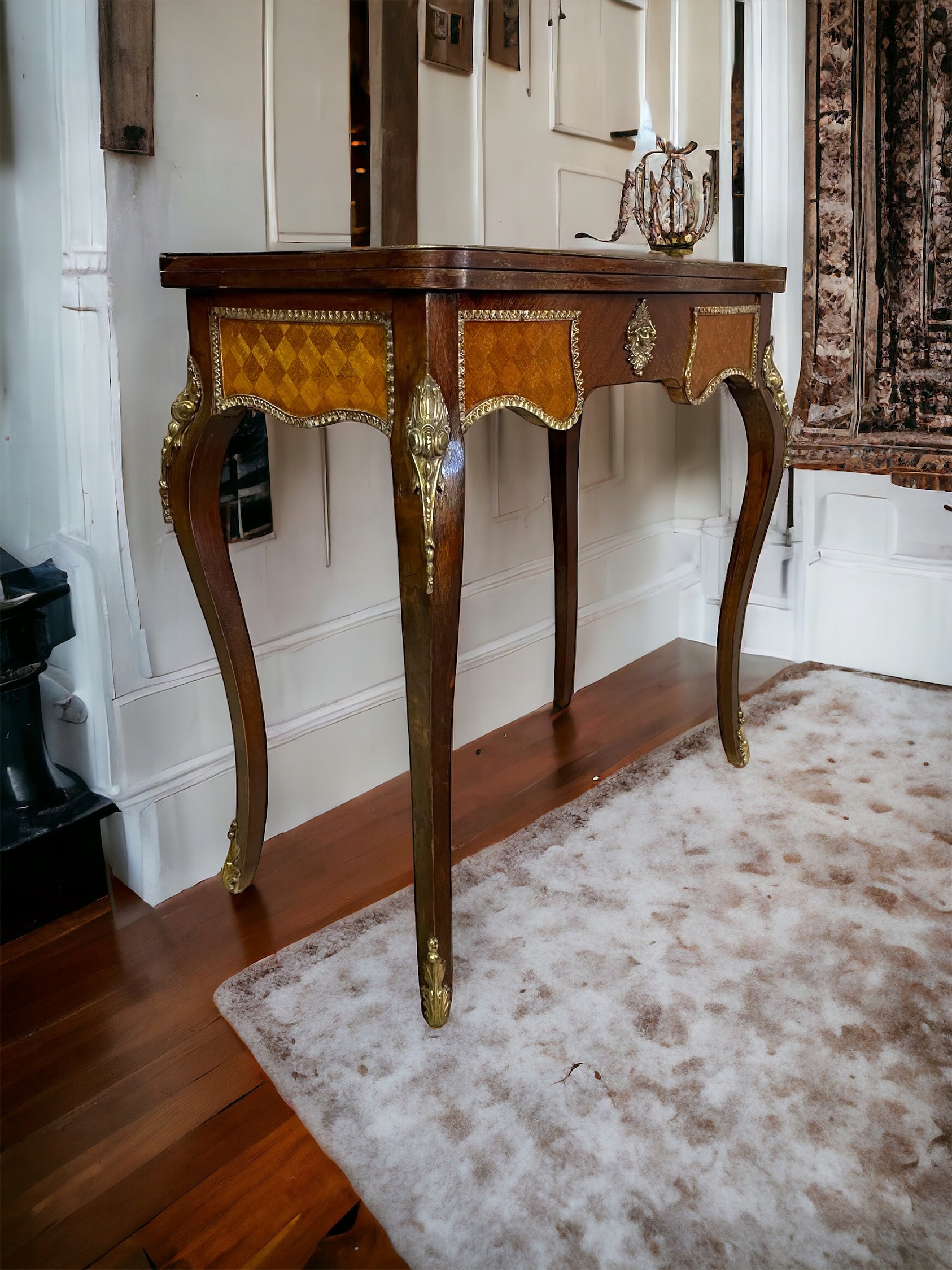 Предметом продажу є красивий так званий ігровий стіл. Картковий гравець. Меблі походять із Франції, а їх виробництво датується 19 століттям. Зроблено капітальний ремонт меблів. Всі старі покриття були видалені, а бронза очищена. Стіл оброблений блискучим лаком шелак. Після ремонту не використовувався, в ідеальному стані. Внутрішня частина корпусу покрита товстим червоним деревом, а центр обертової та відкриваючої верхньої частини покритий зеленою тканиною. Стабільна структура. Стіл в ідеальному стані як технічно так і візуально. Виготовлений з горіхового дерева.