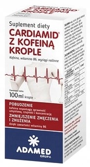 Продукт з унікальним складом інгредієнтів, які: мають стимулюючу дію, сприяють зниженню відчуття втоми і втоми, сприяють поліпшенню концентрація. Кардіамід з кофеїном рекомендується людям, які: відчувають слабкість, втому та втрату бадьорості та брак енергії, бажають підтримати розумову форму та концентрацію.