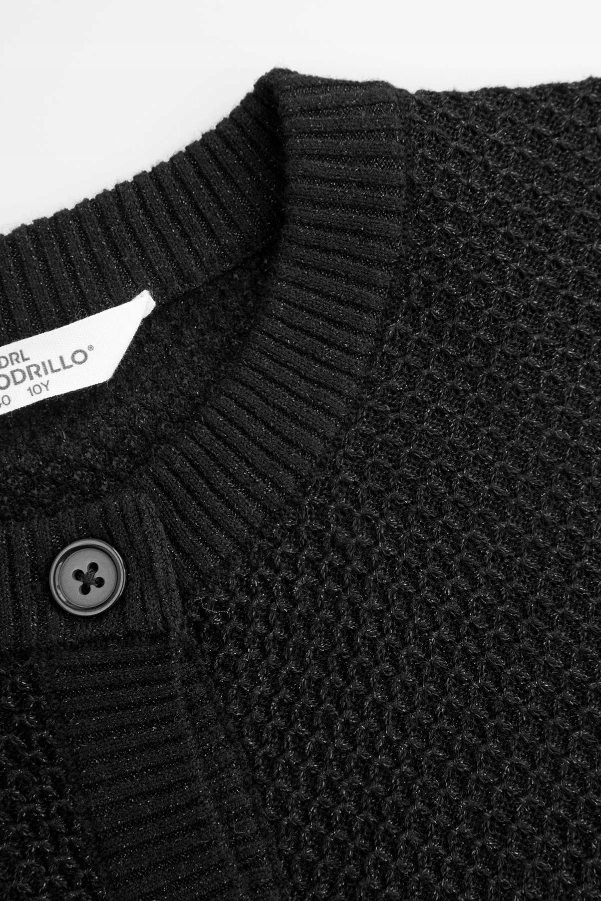 Відкрийте для себе класичний чорний кардиган, який стане улюбленим предметом одягу вашої дочки. Виготовлений з високоякісної товстої пряжі, він забезпечує тепло і комфорт у холодні дні. Светр має довгий рукав і практичну застібку на ґудзик, що дозволяє легко одягати та знімати.